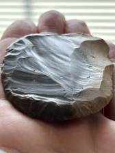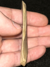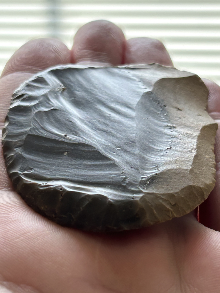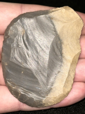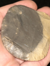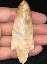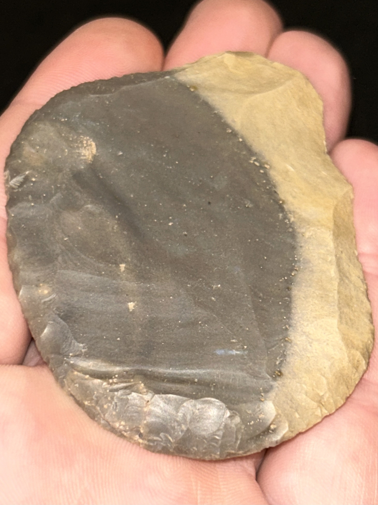 A fantastic uniface knife found in Harrison County, Indiana. Made from glossy two tone Hornstone. Thin and in great condition with fine edge work.