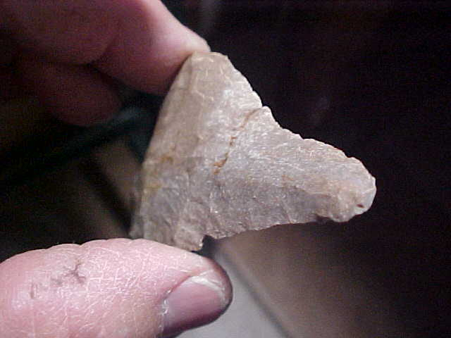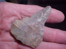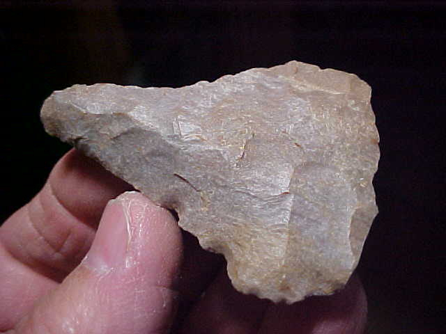 A piece I've held onto for five+ years--I like Cobbs Knives, and converted drills, so this McLean County, Kentucky, piece checked both boxes. The piece is ex Dr. Skaggs Collection of Evansville, purchased from one of his 'finders' back in the early 1990s The flint is (I think) a Muldrough Chert--a lot of fossils in the matrix of the chert,2&3/8" by 1&3/4", a 3/8" thick blade so you know the first-made length was considerably longer--lots of sharpening of the blade, lots of use in-between. One very small fflat spot shows on the very tip (from use, or possibly that's how it finished the last round of Early Archaic chipping, the knapper decided to quit right there--either way, it's intentional, it's not damage. A good piece, real in every detail. Shipping is $8.00, checks or M.O.s are welcomed. Sorry, I do not accept paypal--Roy A.