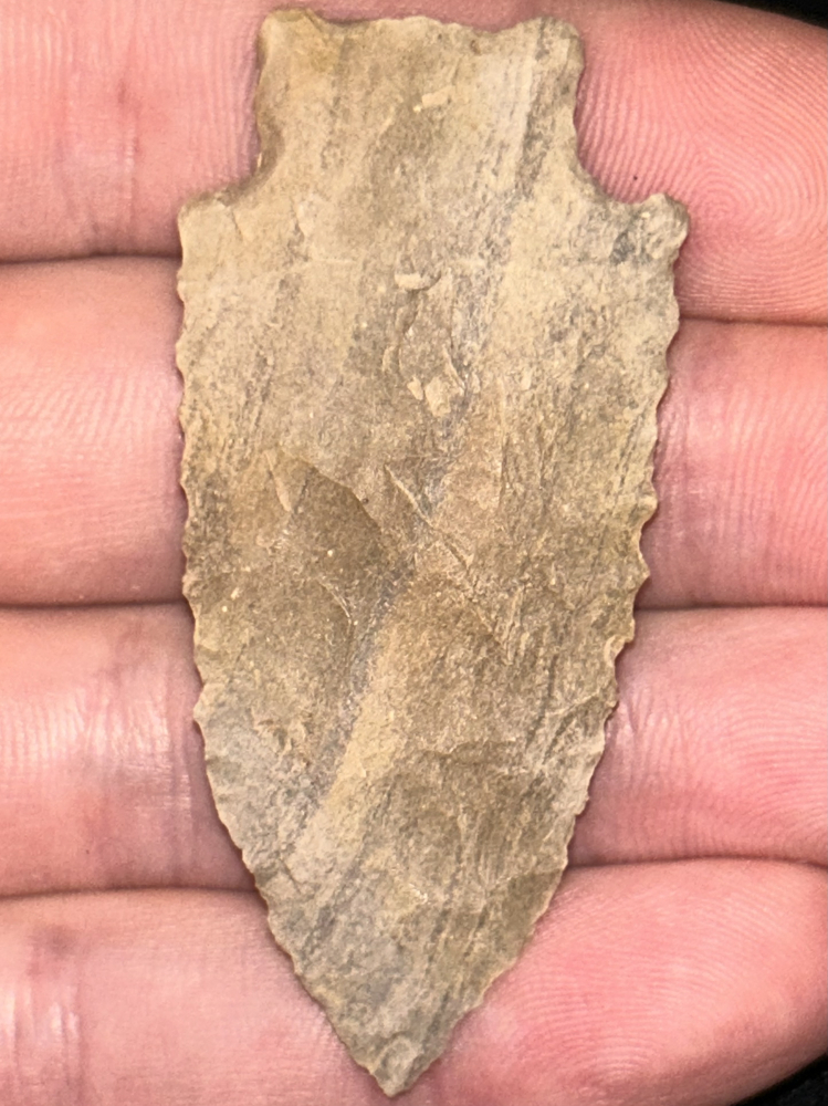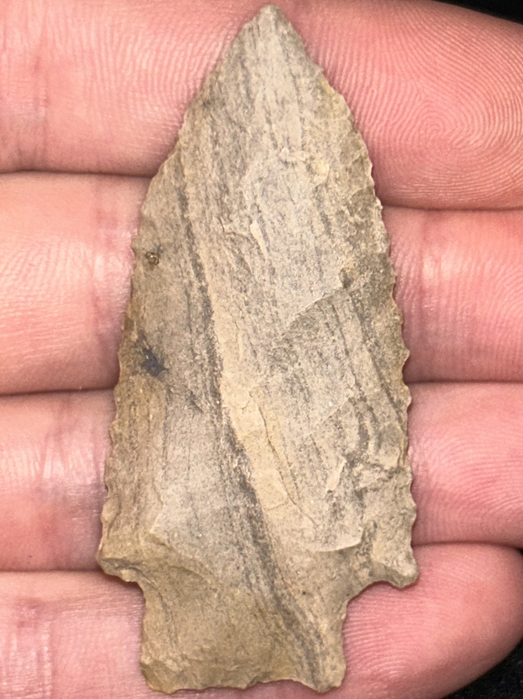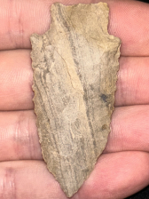 A fine Stemmed Kirk found in Harrison County, Indiana. Made from attractive striped Hornstone. Well made and nicely flaked with lightly serrated edges.