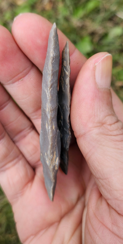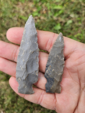Real nice pair of Bakers Creek era points. Found in and around Dickerson Cave in Todd County, KY ex Dossett. Both are very well made and have nice deposits. Largest measures 2 7/8 inches long. Great addition to your Kentucky frame!