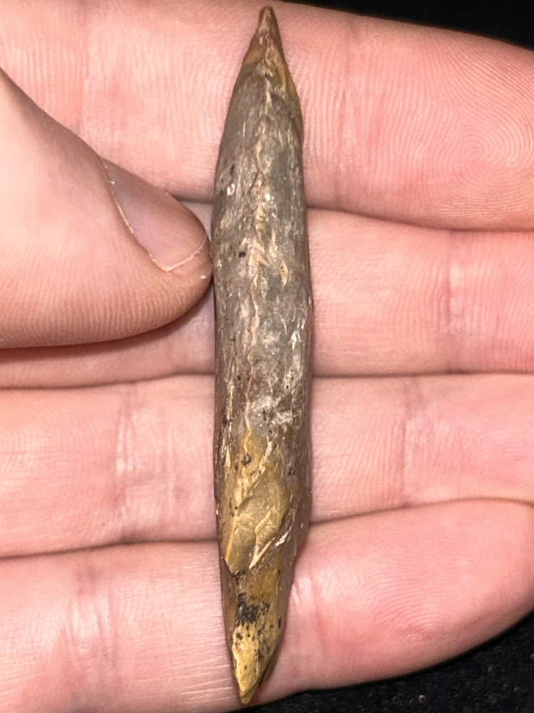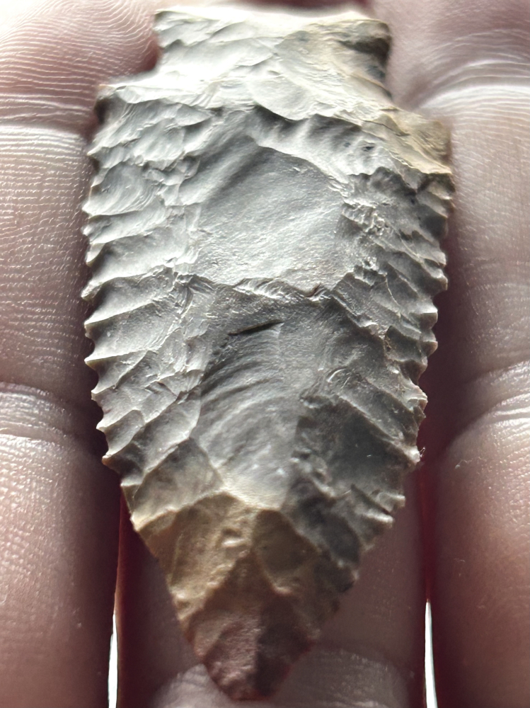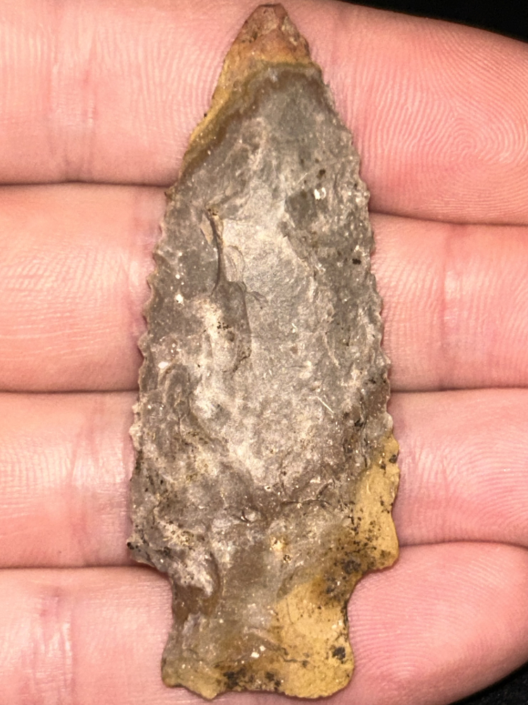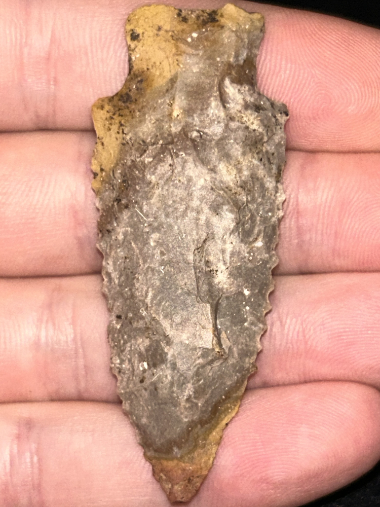 A fabulous Heavy Duty found in Stewart County, Tennessee. Made from very colorful deeply patinated Fort Payne chert. Classic form with great flaking and lightly serrated edges.