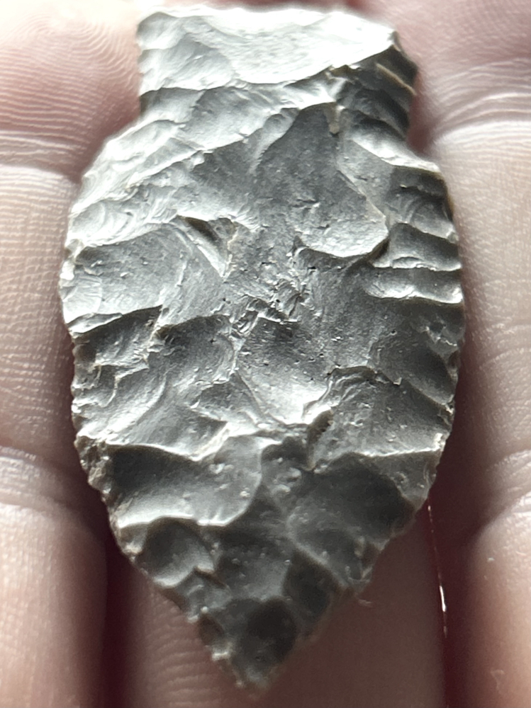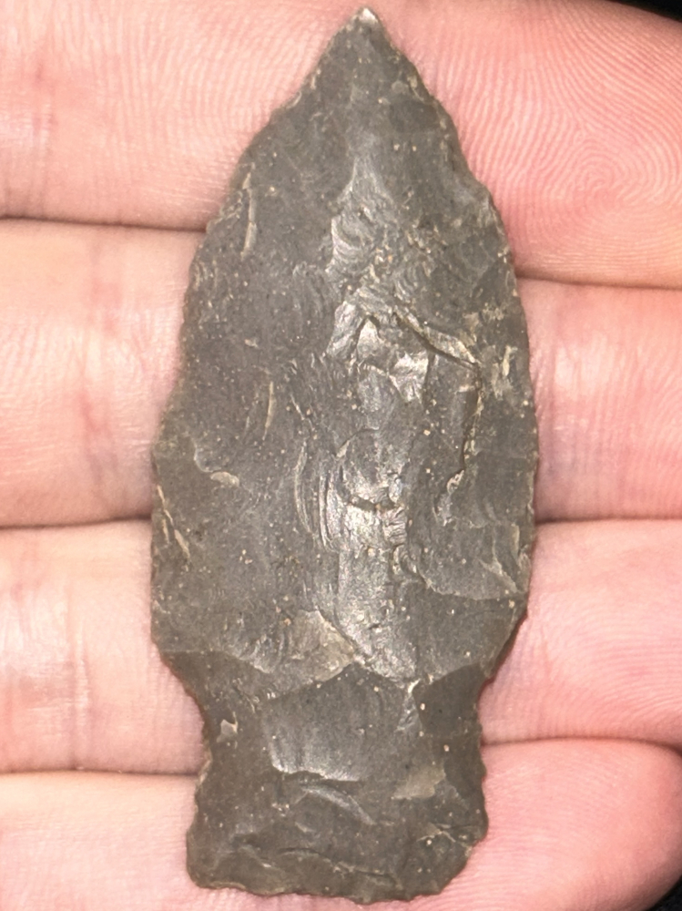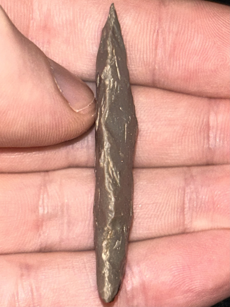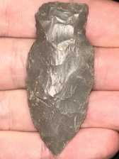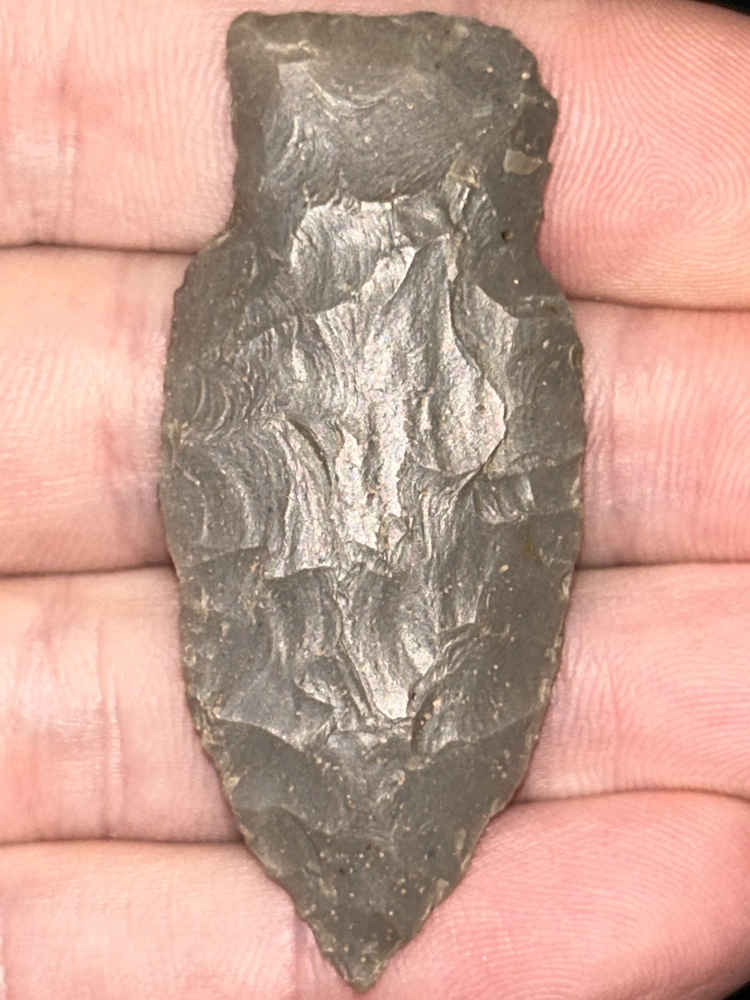 A nice Bakers Creek found in Harrison County, Indiana. Made from glossy medium grey Hornstone. Well made with good flaking.