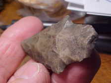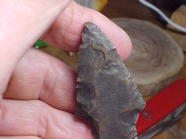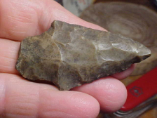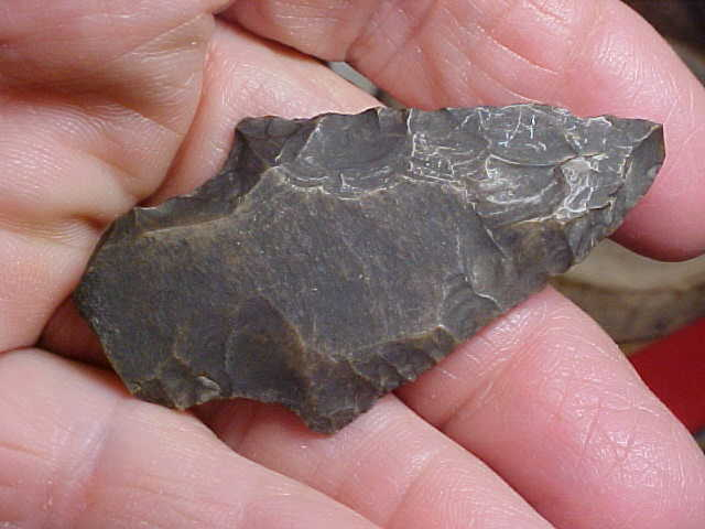 If anyone, I seriously mean ANYone misses the creekstain on this Daviess County, Kentucky, Adena, well, it's time to change your glasses. The piece was found some fifteen years back by an old friend, the details he gave me will be included with the sale--provenance matters. Made of hornstone, the length is 2&5/16" by 1&1/4"--5/16" is the max thickness. The base is not broken, a 'make it fit the handle' flint chip was removed when the Woodland hunter didn't like the way the piece hafted--he flattened the basal edge. It may not show in the photos but the tip is heavily use-polished from buffing. Were they working hides or some other surface (bone tools)--regardless, you can feel the polish the flint took on. Shipping is $8.00 (USPS minimum for small boxes), and I take payment ONLY by forms you can send through the mail: checks, cash, or M.O.s. Thanks for looking--Roy A.