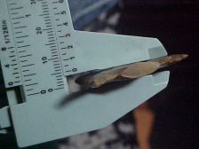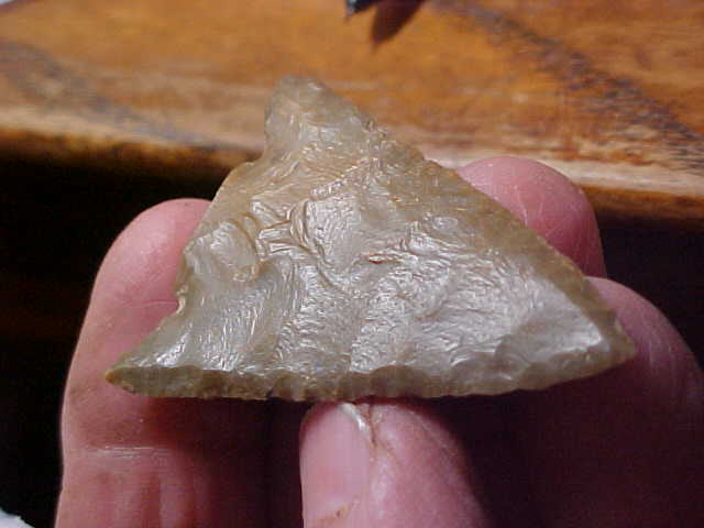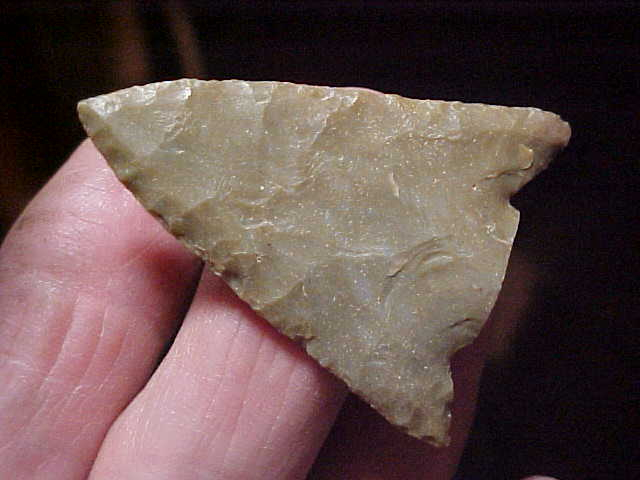 Held in my $2 Harbor Freight caliper, you can read the max thickness of this Woodland creek find: 3/16"--made of a brown patinated Indiana Hornstone, 2&1/16" by 1&1/2". Barbs and tip are perfect, the stem--if the Buck Creek ever HAD a stem--it patinated over. The flat edge of the stem is so flat I don't think there was a stem--flint doesn't usually break off that perfectly from use. The piece is out of Vanderburgh County, Indiana, it's 100% guaranteed authentic. Shipping is $8.00, checks cash, or M.O.s are the only ways I take payments. Sorry, that means paypal is out--Roy A.