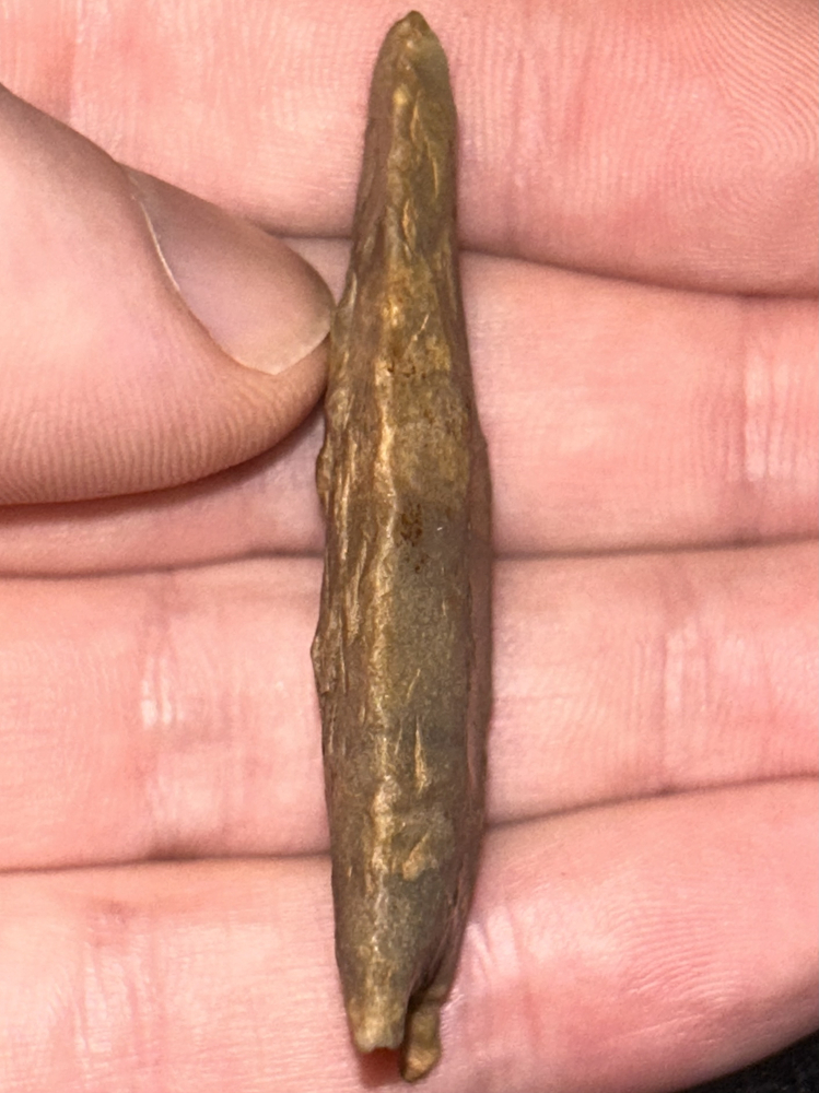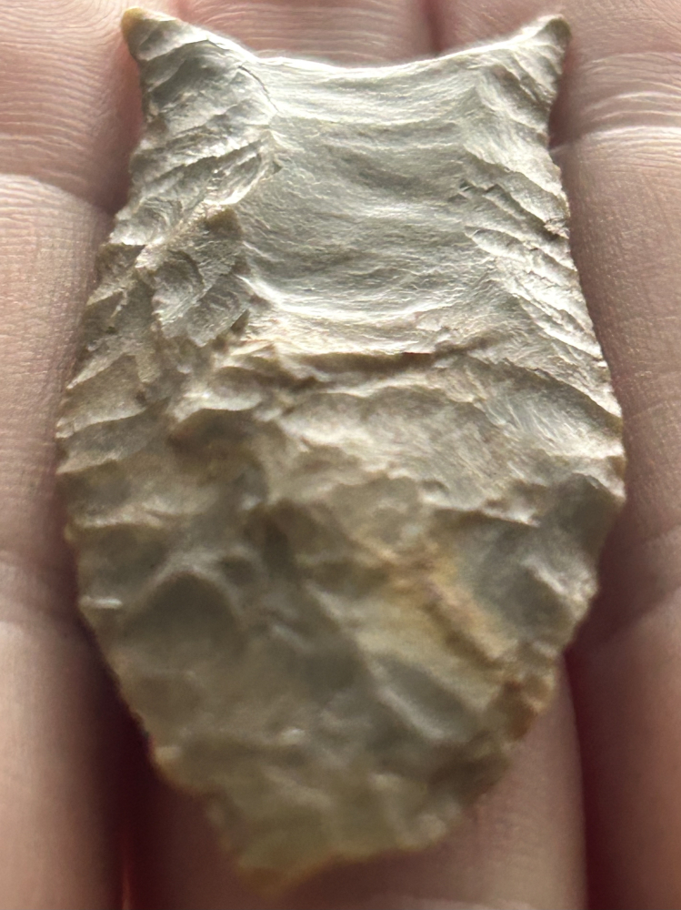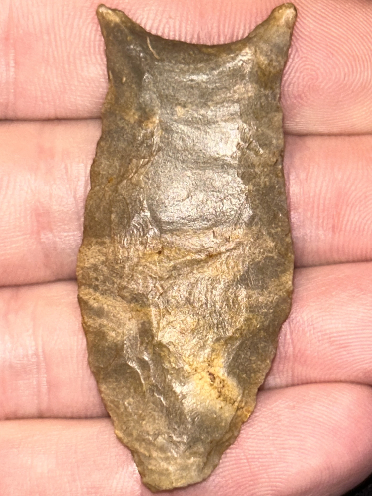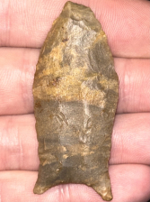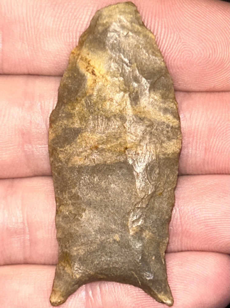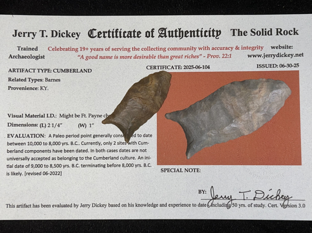 A fantastic Cumberland found in Kentucky. Made from light brown mottled Fort Payne chert. Finely made with good basal grinding and fluting approximately 50 percent up both sides. Comes with a Dickey COA.