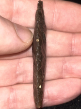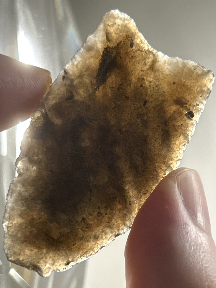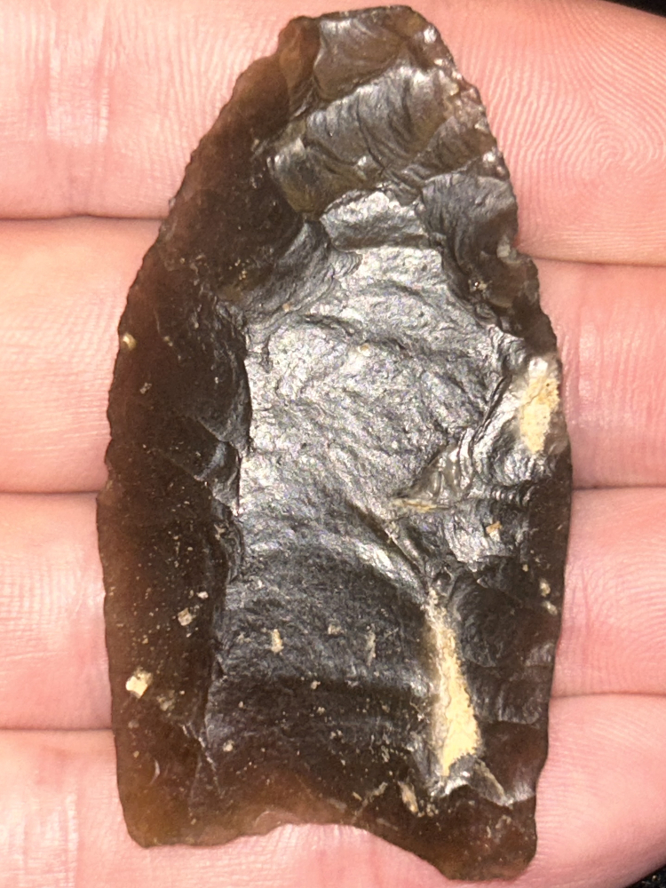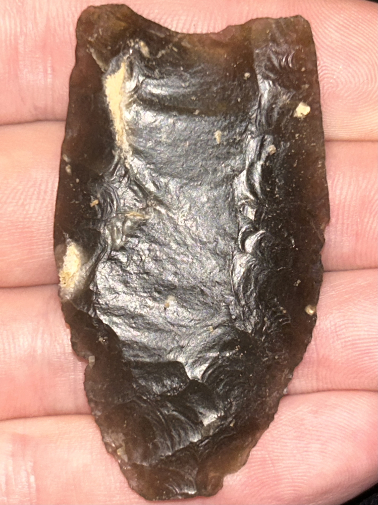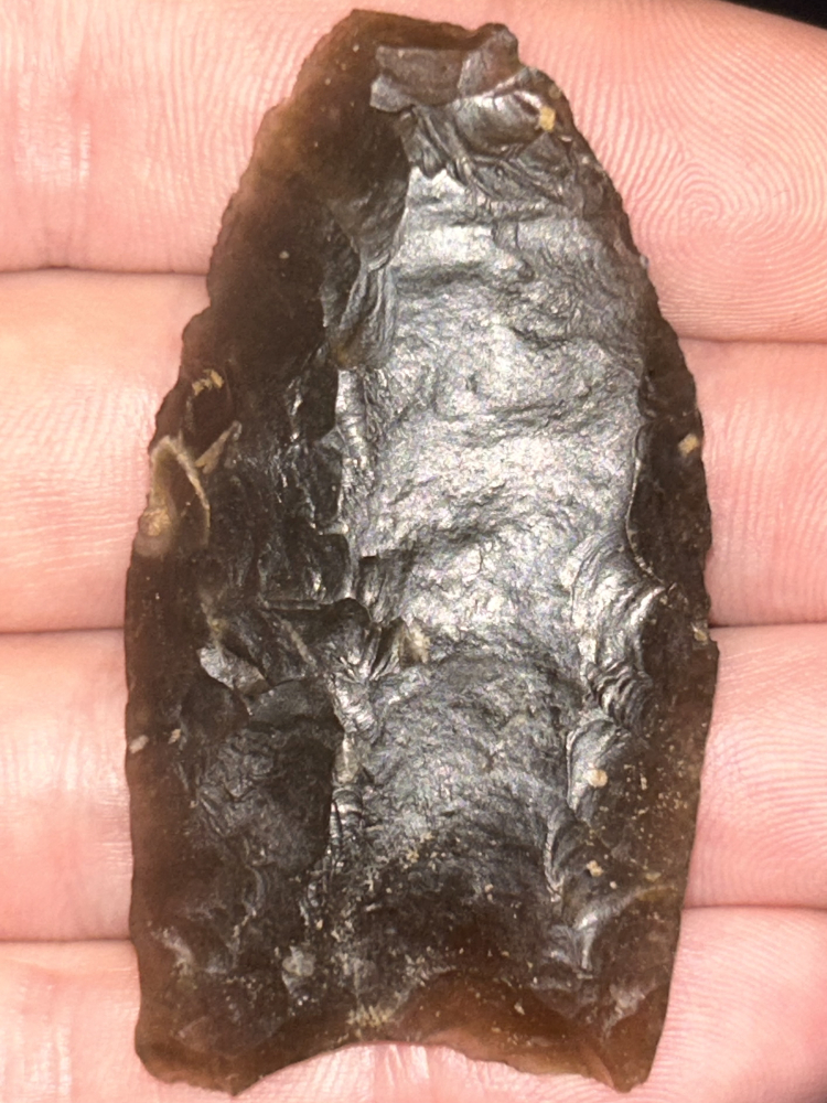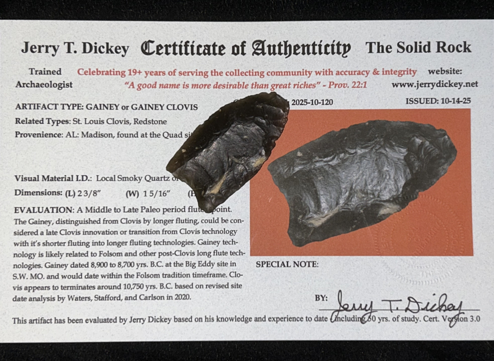 A phenomenal Clovis found at the Quad Site in Madison County, Alabama. Made from highly translucent local smoky quartz or similar material. Finely made with excellent flutes and basal grinding. Comes with a Dickey COA.