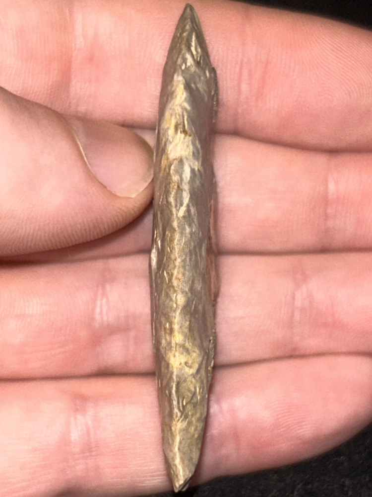 An outstanding Clovis found in Grayson County, Kentucky. Made from attractive mottled Fort Payne chert. Great style and very finely crafted. Ex: Doug Goodrum.