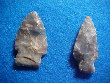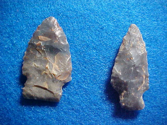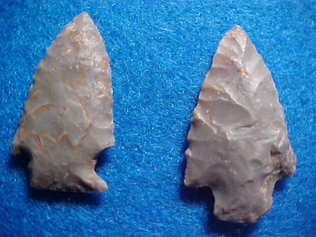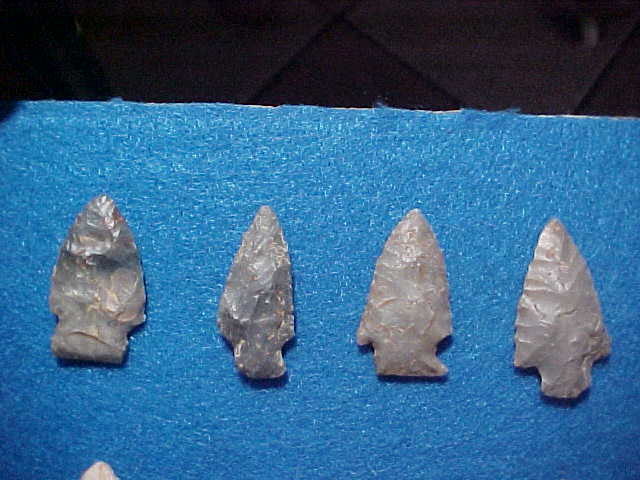 Shipping included on these Taylor County, Kentucky, hornstone dart points--nice points, presently GLUED to a felt-covered board (that's why you're only seeing the front side. The longest is 1&5/8" (the stemmed one on the right end). A second look makes me think the two on the left end are actually Sonora Flint, not hornstone. The Palmer on the right, one in, has basal grinding, as does the expanded stem Sonora on the left--that'd classify them as Early Archaic in origin, not Late Archaic as the finder thought. Good dart points, real. I welcome checks, cash, money orders or driveway gravel (I need some of that), but I do not use paypal--Roy A.