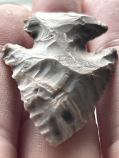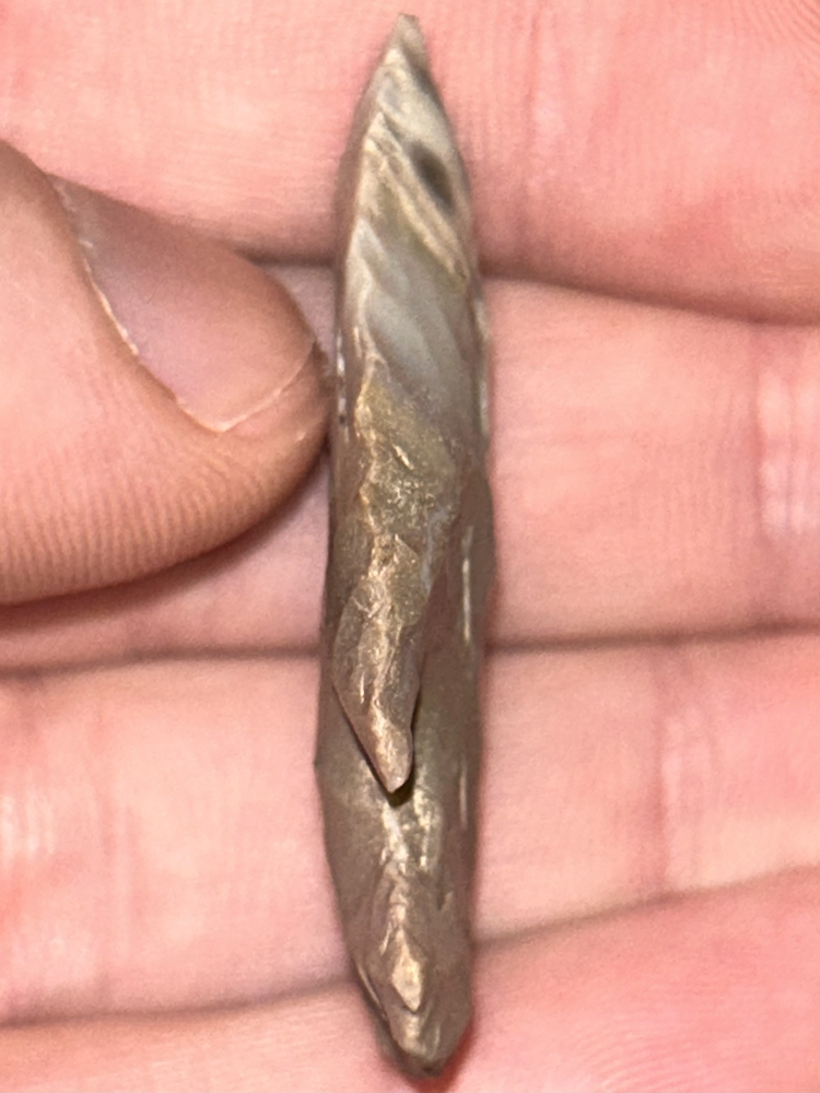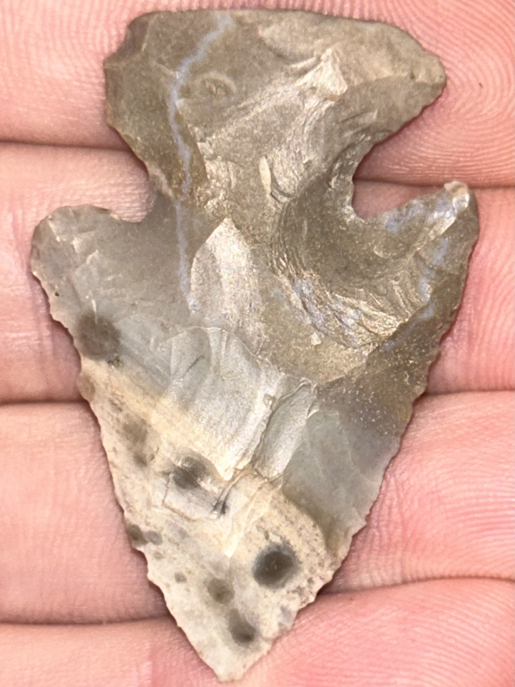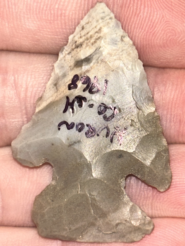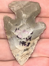A super nice Thebes found in Huron County, Ohio by Jack Hooks in 1968. Made from colorful Pipe Creek chert. Well made with great bevels and ground base. Ex: Doug Hooks.