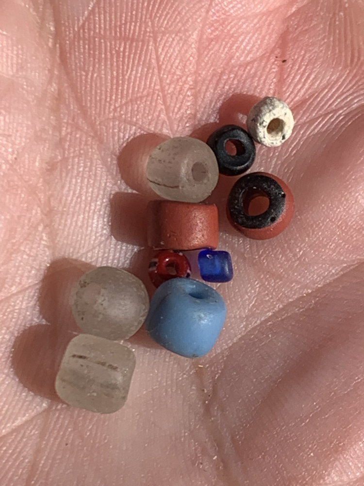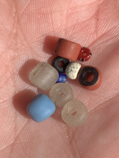This includes 3 large clear beads, one red green heart, a solid red bead, a heavily aged white bead