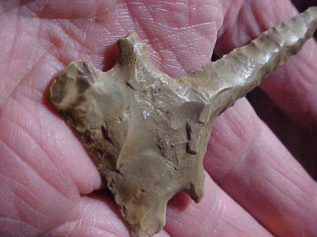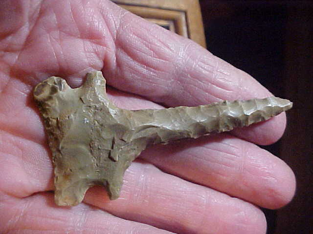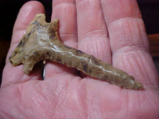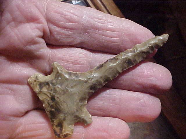 Well, since there doesn't seem to be much buying on Arrowheads.Com right now, I'm kind of sitting back, taking a break--we'll see how things go as the holiday approaches. What I'll be listing in the meantime will be "eye candy"-- pieces I've put away for "Some day in the future", just something to share with the community--this Big Sandy Broadbase being one of my long-time favorite points. A creekfind by creek hunter Timmy A.--a Kentucky piece, Union or Webster County. Patina, well, if you can't spot it, get new glasses. Length is 3&3/16" by just shy of 1&1/2" width--the auriculate base is heavily ground, so you know it's Early Archaic Culture in origin. A very good Thanksgiving from my family to yours ! Roy, Jo, and daughters