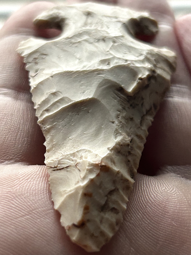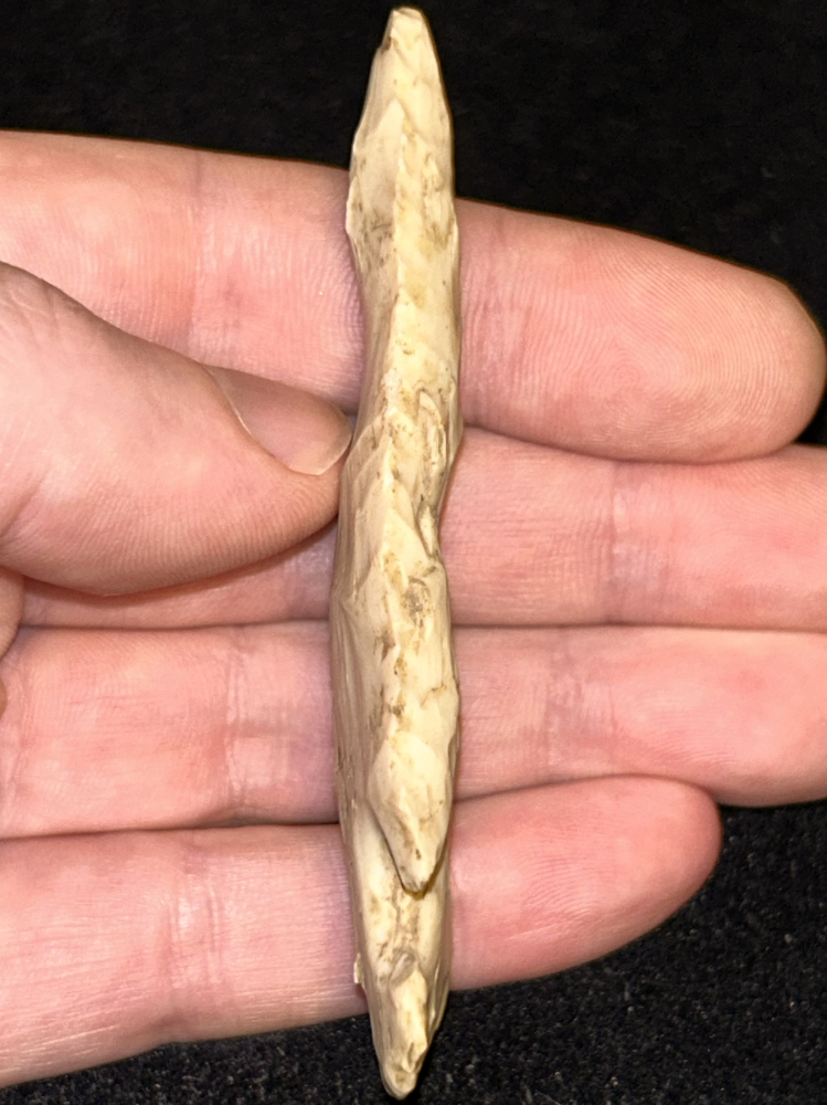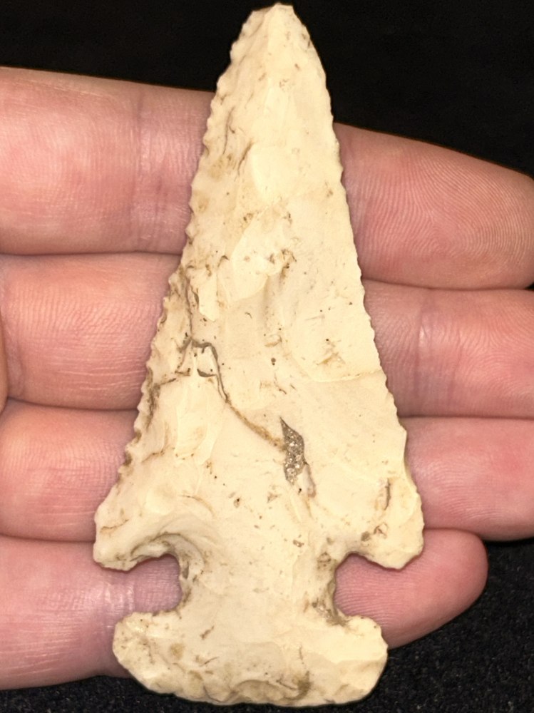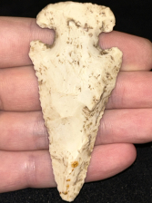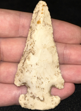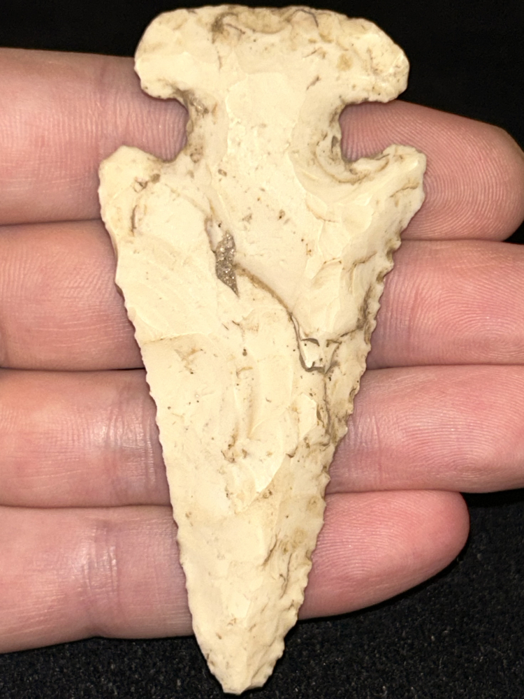 An excellent Thebes found in Dubois County, Indiana. Made from well patinated off white Burlington chert with great mineralization. Very nice style and form with finely flaked beveled and serrated edges.