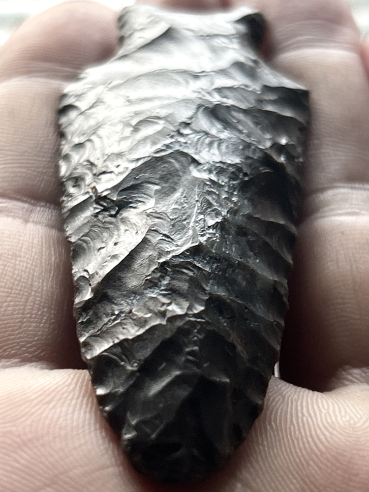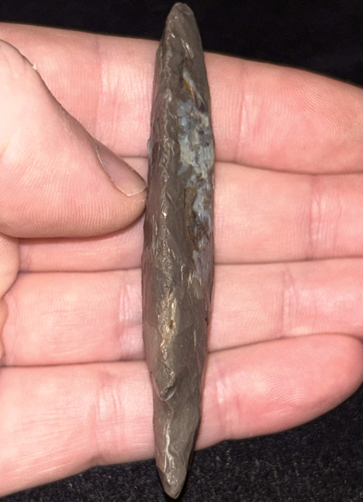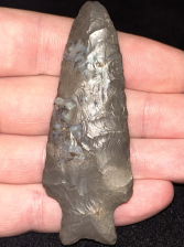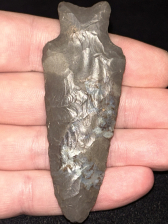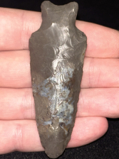 A fabulous Heavy Duty found in Warrick County, Indiana. Made from glossy grey Hornstone with colorful inclusions throughout the piece. Classic form with excellent flaking and workmanship.