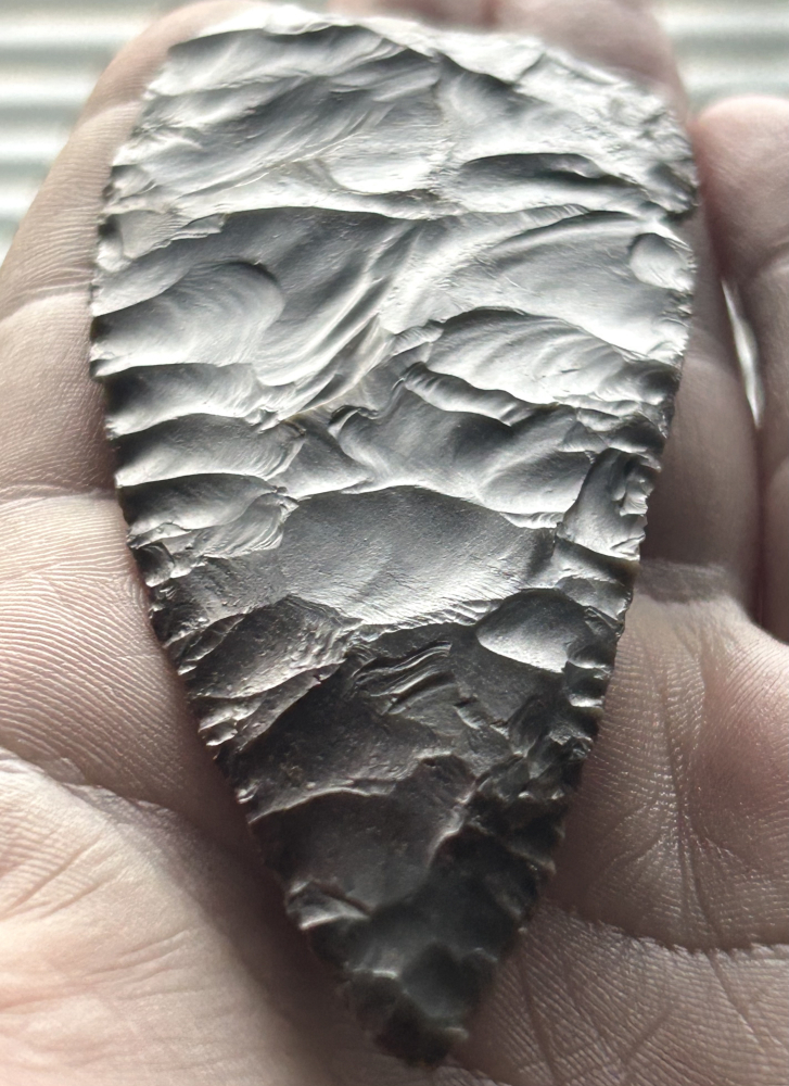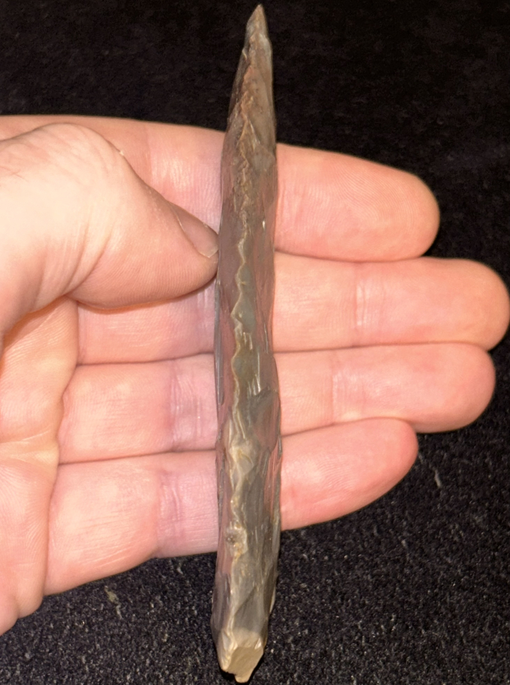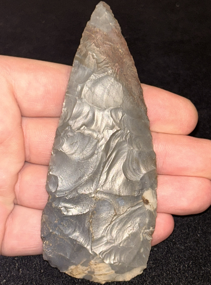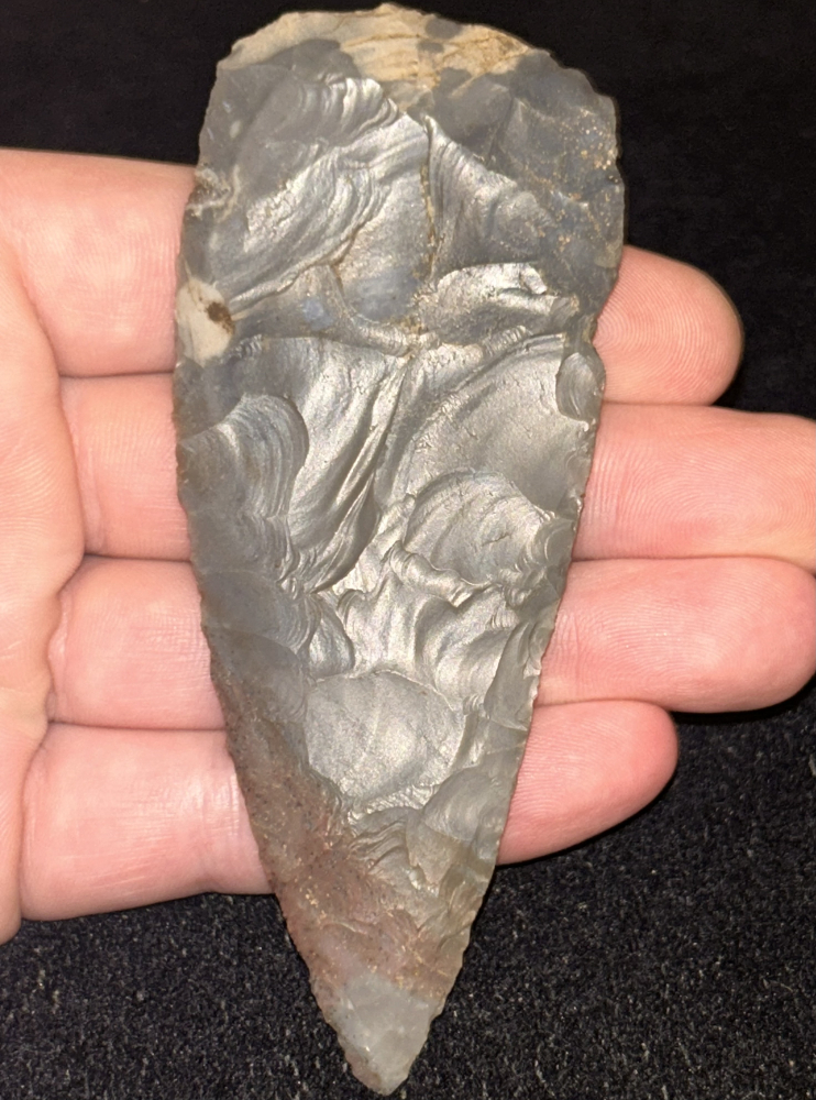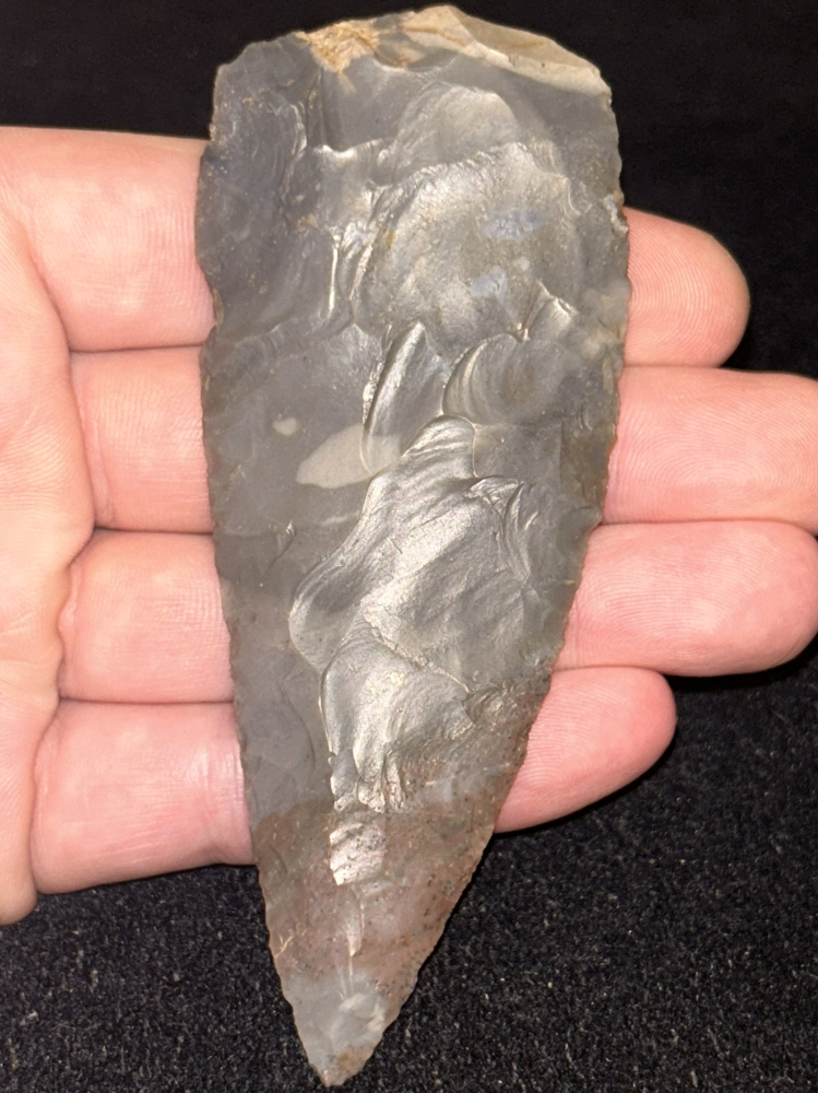 A fantastic Cobbs blade found in Barren County, Kentucky. Made from glossy blue, grey, and purple Sonora chert. In great condition with excellent size, workmanship, and flaking.