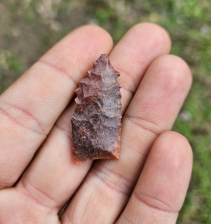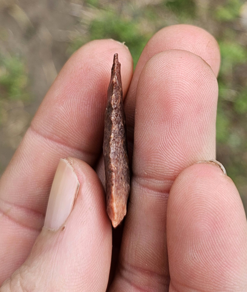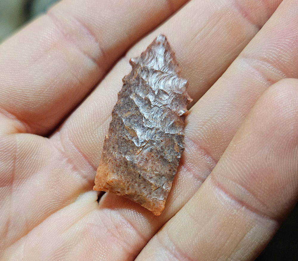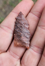 Phenomenal and rare Midland point from Apache Co, AZ. Very rare and and beautifully serrated form of the southwest midland. Made from gorgeous mottled jasper with heavy grinding on basal margins. Measures 1 1/4 inches long. Stellar little paleo that is an absolute must!