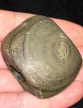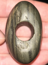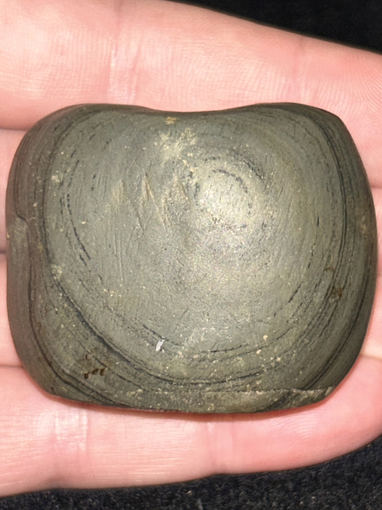 A fantastic bannerstone found in Jefferson County, Kentucky. Made from well patinated green banded slate with a great ‘worm track’ across one side. In fine condition with excellent polish and drilling.