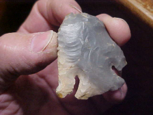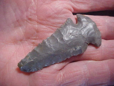 When I was a muuuucch younger collector these Lost Lakes (with the very long barbs) were called "Deep Notches". The name speaks for itself, doesn't it? This Indiana Hornstone-with-cortex Lost Lake is out of the Spencer--Perry County, Indiana, area--length is a 'reduced' (by use and Early Archaic period salvage) 1&15/16". Width is an excellent 1&11/16" and-- to tell you the blade was once much longer--thickness is 3/8" max. When you have that thick of a blade you are assure the hafted knife started out considerably longer. As photographed, there are a couple tiny (yellowed) glue spots--the estate auction had two emptied-out Riker Frames, so my guess is that the point (and others in the small collection) had been 'tacked-in' with glue. The basal edge is heavily ground. Not seeing a steep bevel, I'd say the knife was broken, salvaged, and lost before it'd seen a great deal of use--otherwise the bevel sharpening would have been steeper, the blade more narrow. The close up photo should show how long and ex-curvate the longer barb is, fine, fine knapping. The collection history I have will go to the next owner, provenance matters. Shipping is $8.00 with payment only by one of these three methods: checks, cash, or money orders. I do not use paypal-type payment services--Roy A.