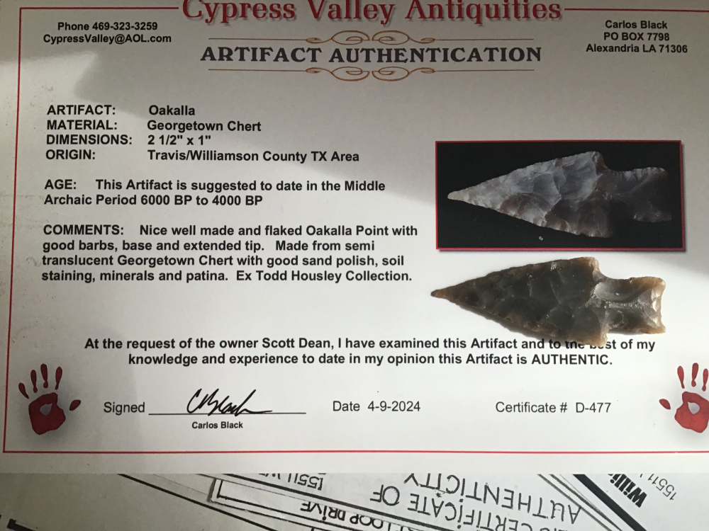 This Oakalla, made of Georgetown chert, is semi-translucent and well flaked from Tavis/Williamson County area. It has an extended tip and comes with a Carlos Black coa. I have the shipping.
