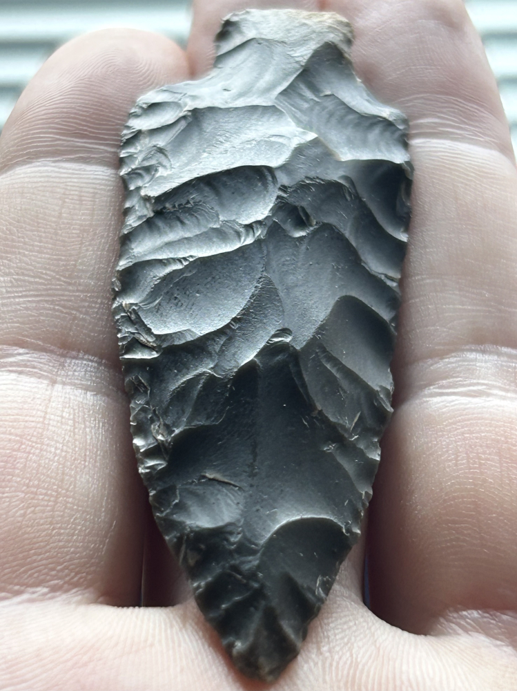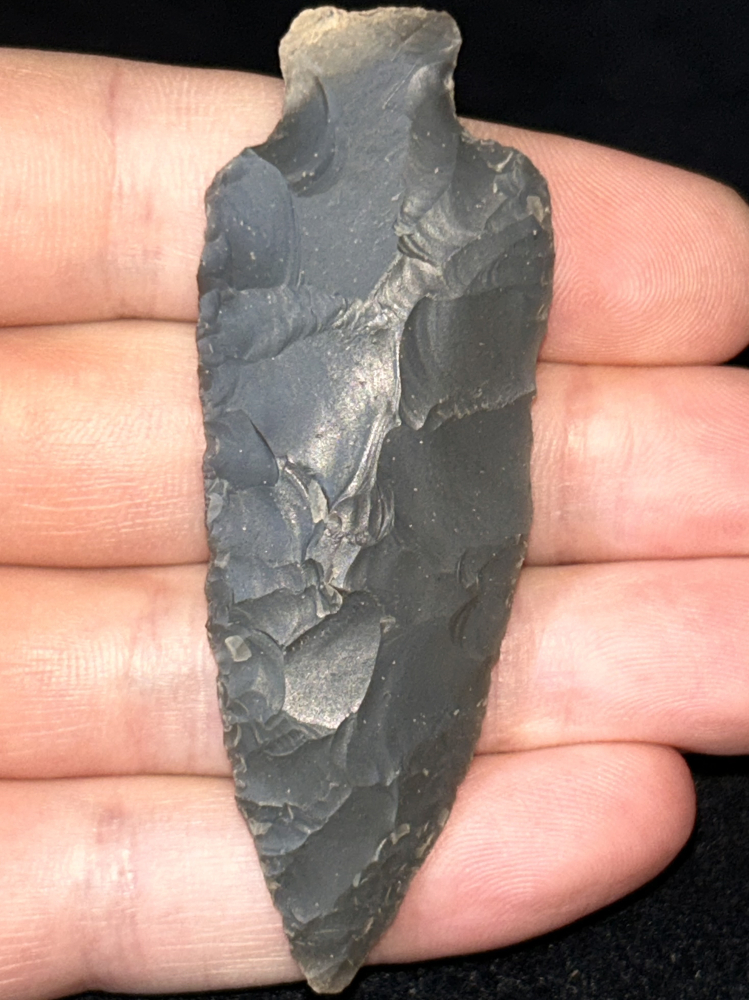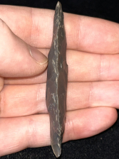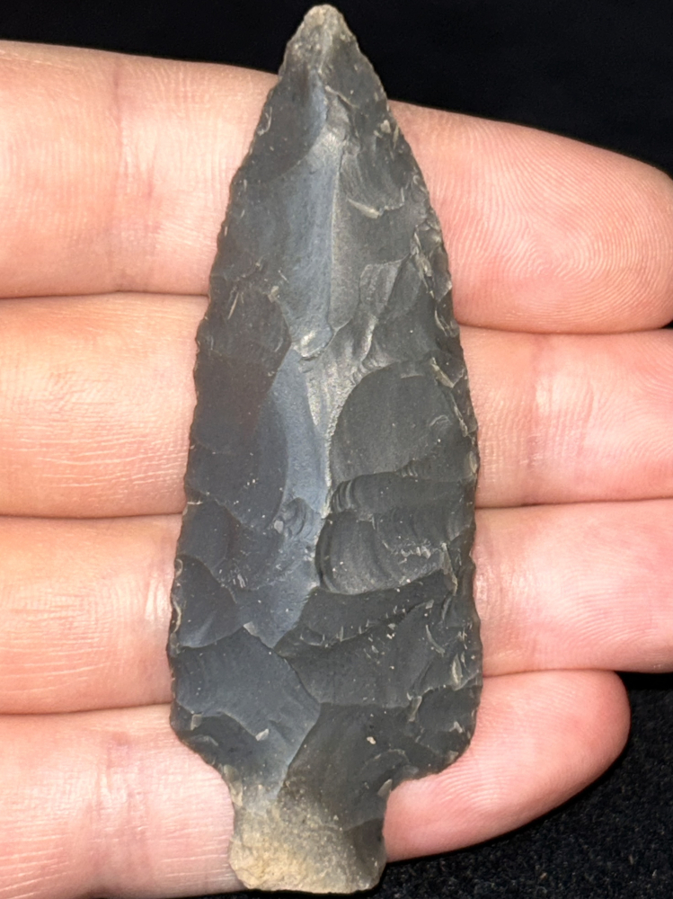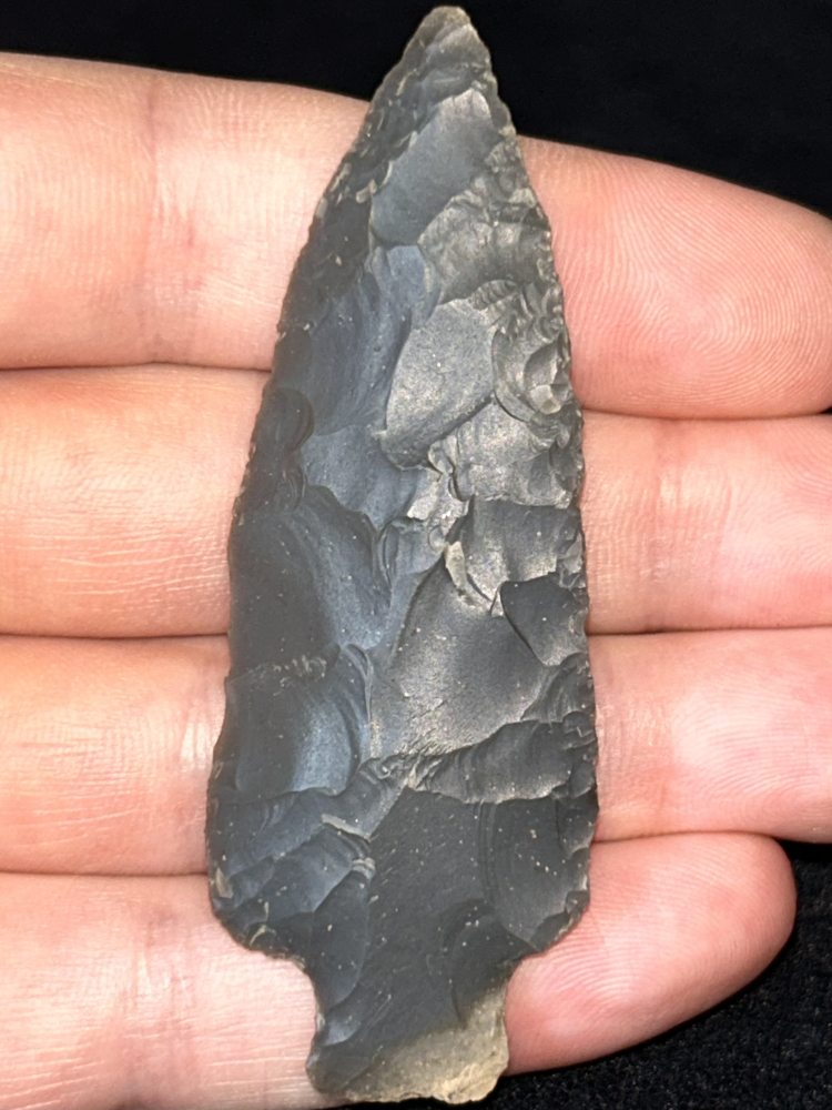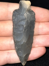 A very nice McWhinney Stemmed found in Harrison County, Indiana. Made from semi glossy deep blue-grey Hornstone. Nicely made with great flaking.
