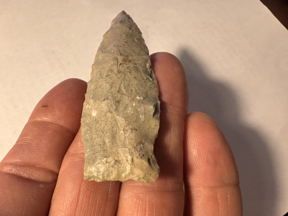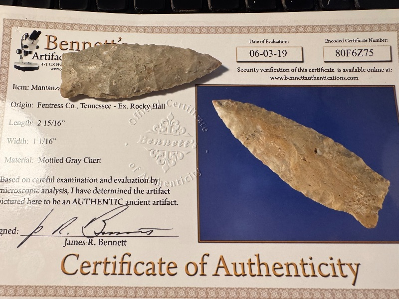 Fine Matanzas out of Tennessee from the Rocky Hall Collection. Recovered in Fentress County, It has some ancient soil deposits made of Mottled Gray chert. I have the shipping and it comes with a Bennett coa.