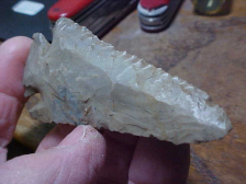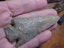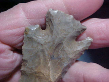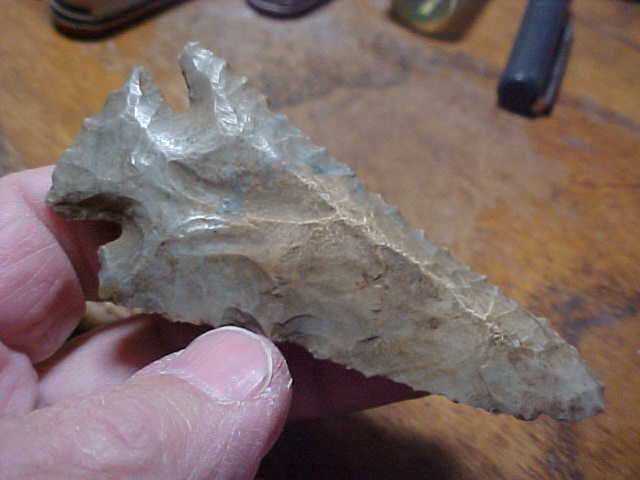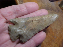 A part of an old (small) Spencer County, Indiana, family collection, this hornstone Lost Lake is 3&1/2" by 1&9/16". The steeply beveled blade is a full 3/8", so you know (based on the sheer number of blade sharpen-and-use cycles) that the hafted knife was once both longer and wider. One barb is salvaged (from use and the sharpening process), it isn't broken, just worn-away--worn in the same way what was likely a sharp tip now shows heavy Early Archaic period use--before the knife was lost. I'll carry that same "worn" label to the ground basal edge--the knife may have been hafted several times, the basal edge slightly altered so it'd fit a handle each time. All that (wear) is part of the 100% guaranteed authentic patina. Hell of a piece, period. $7.00 is the shipping cost. Payment--you have three--and ONLY three options: cash, check, or money order. If none of those three work for you, well, thanks for looking, anyway--Roy A.