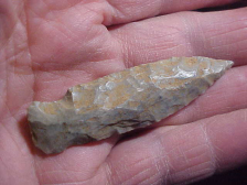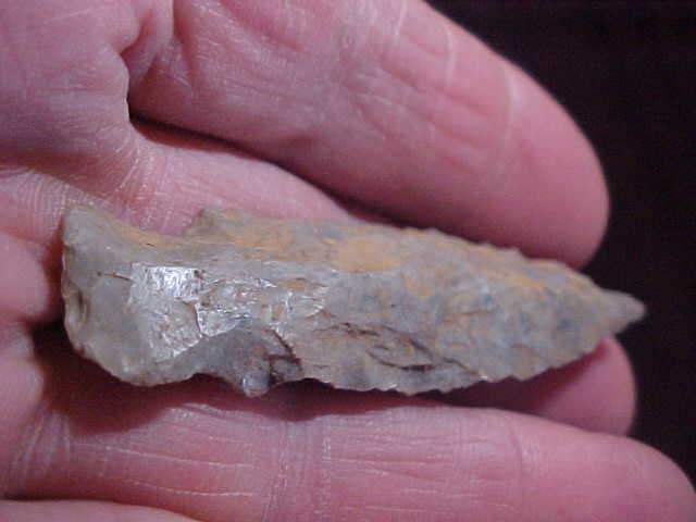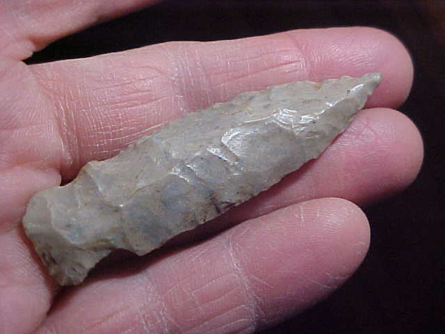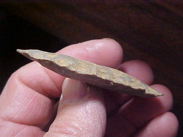 The first look, as I pulled this sort-of-thick point from its frame--"I've seen those before", and a quick reference to Overstreet confirmed the classification: Fishspear The thickness is the first thing that strikes you (5.5 sixteenths), and a 'tail' that expands, not straight, rounded, or contracting. Too, the parallel flaking indicates a more "Early Archaic structure", many of the upper end flakes being oblique flaked, that nice angled flaking you see on points like an Elk River. This hornstone point, 2&3/4" by 3/4", is very typical in terms of size. The finder, somewhere in the corner of S.W. Indiana, didn't wash the piece, field dirt still there in the crevices, the 'patina' exactly as the piece came from a field--authentic. Shipping is the USPS minimum for a small box, $8.00 (yeah, gripes me too), and I take payment ONLY by the three methods you can send through the postal service: cash, checks, or money orders--Roy A.