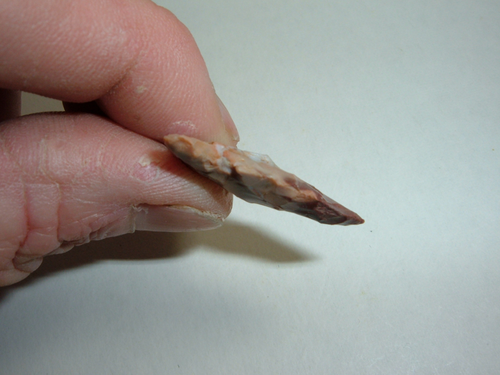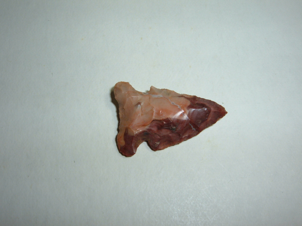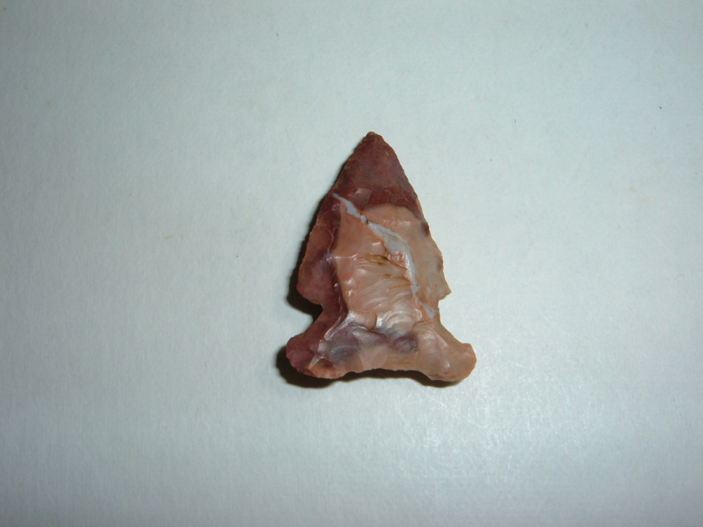 HERE WE HAVE A BEAUTIFUL SUPER COLORFUL EOB C. FOUND IN FAIRFIELD CO.OHIO IT MEASURES 1 1/8" AND IS ILLUSTRATED IN BOB'S BOOK "THE ARTIFACT COLLECTION OFROBERT N. CONVERSE. IT HAS A BEAUTIFUL QUARTZ VEIN RUNNING THROUGH IT ON ONE SIDE, A REALLY DELIGHTFUL,COLRFUL LITTLE POINT!