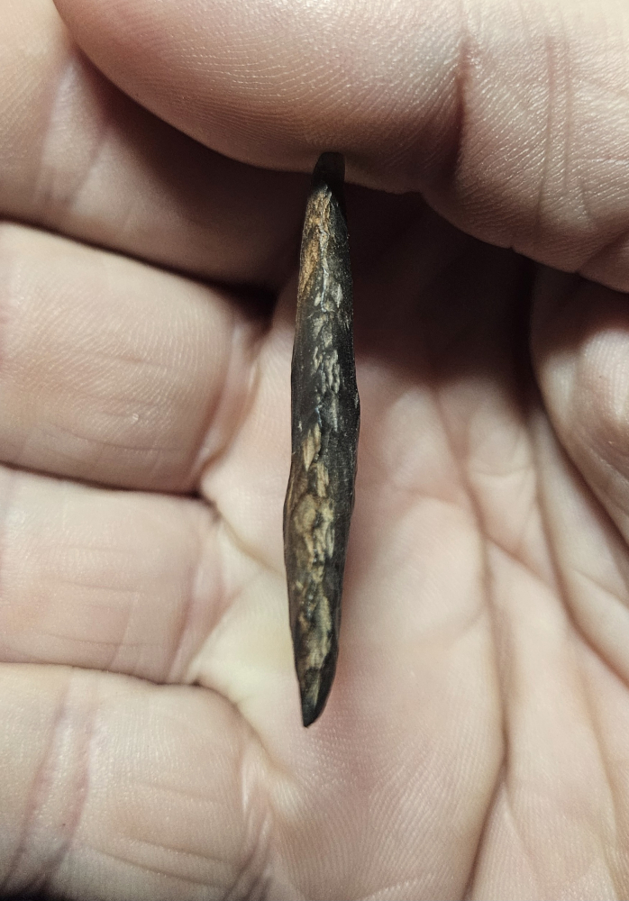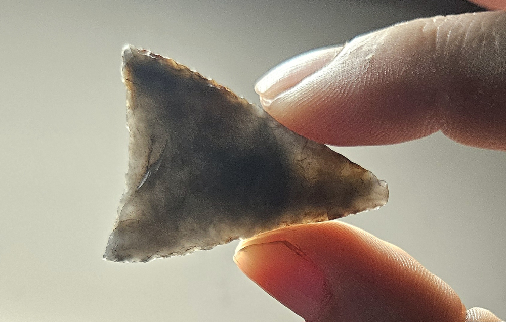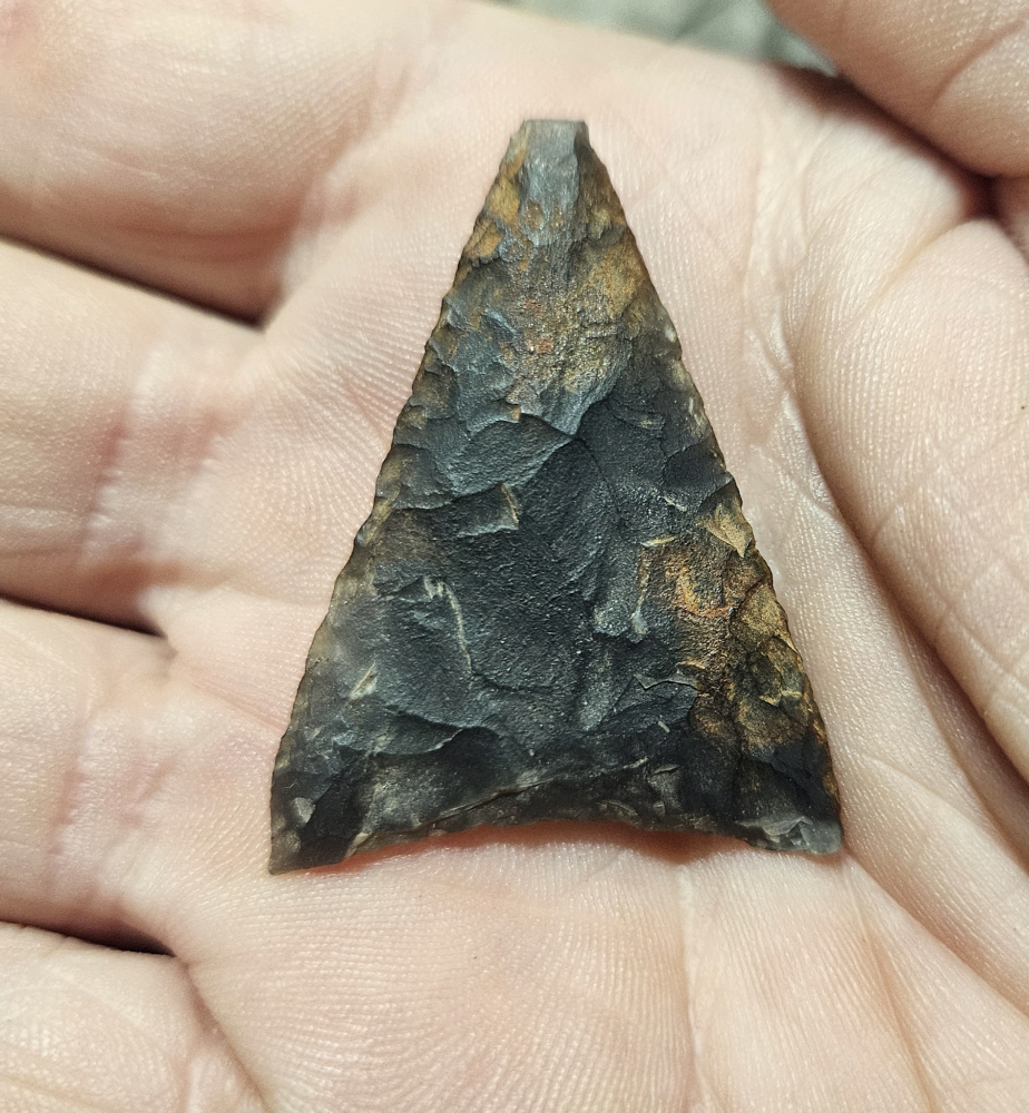 Rare Levanna point from New York. Extremely well pressure flaked on a very rare piece of material known as Ramah chert. Highly translucent and beautiful, minor tip ding keeps it affordable. Measures 1 1/2 inches long.
