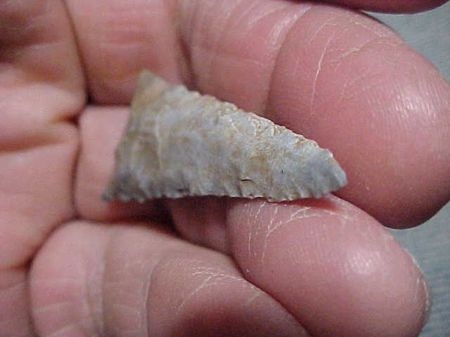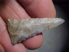 Length of this Indiana Madison point--Mississippian Culture, 1250--1400 common era, is an excellent 1&11/16" by 3/34" width and 3/16" max thickness. It comes from the Vanderburgh County, Indiana, area--once the site of very large Miss. village until something dispersed a thousand people to sites farter west, down the Ohio River in riverbottoms on both sides of the river west of Evansville, Indiana (and Henderson, Kentucky)--you know something more about the area some artifact comes from, you understand more of how it was made, used, and lost. The flint here is kind of a puzzle, it's possibly a nodular flint a knapper found along the river, utilized--it doesn't show the color of Indiana Hornstone or other small deposit local flints. The other possibility I've considered is that the flint was a rock used as a campfire ring, accidental heat altering--the sort of "purplish color" would fit for a flint that had seen heat 'tempering'. Patina is excellent, every detail is guaranteed authentic. Shipping is $8.00, USPS minimum for a small package, and I welcome checks (cash) or M.O.s, but do not use any sort of paypal-type electronic payment--Roy A.