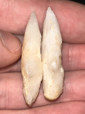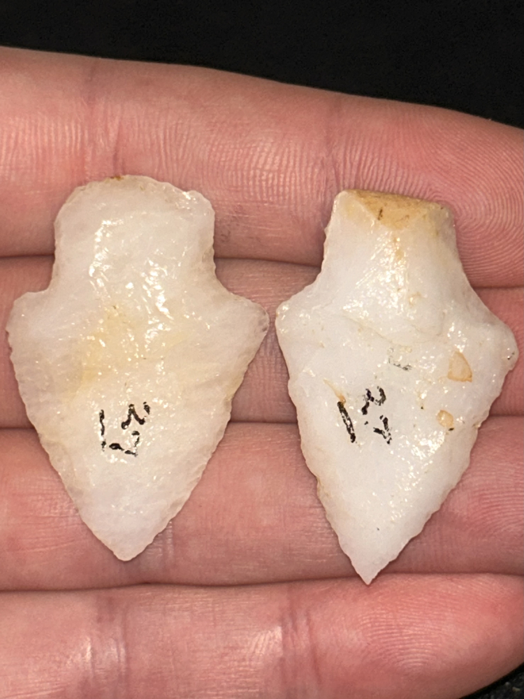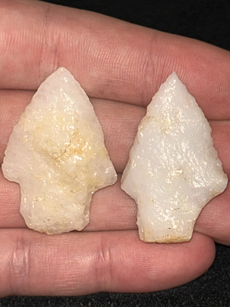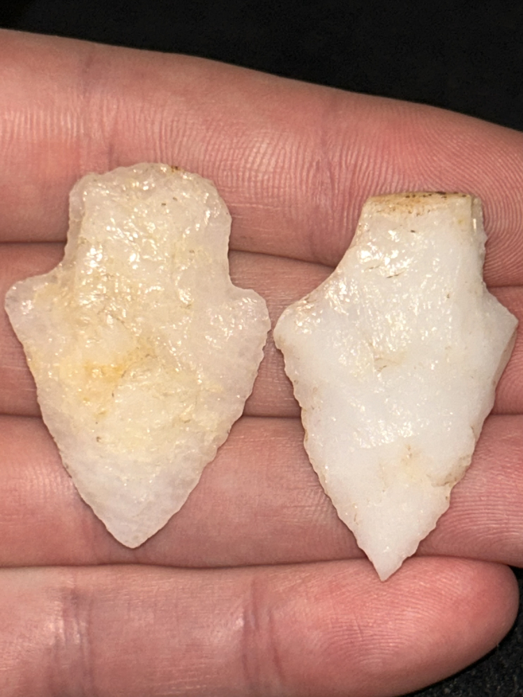A great pair of stemmed points found in northern Alabama. Both are nicely made of translucent milky white quartz. Ex: Billy Wayne Smith collection.