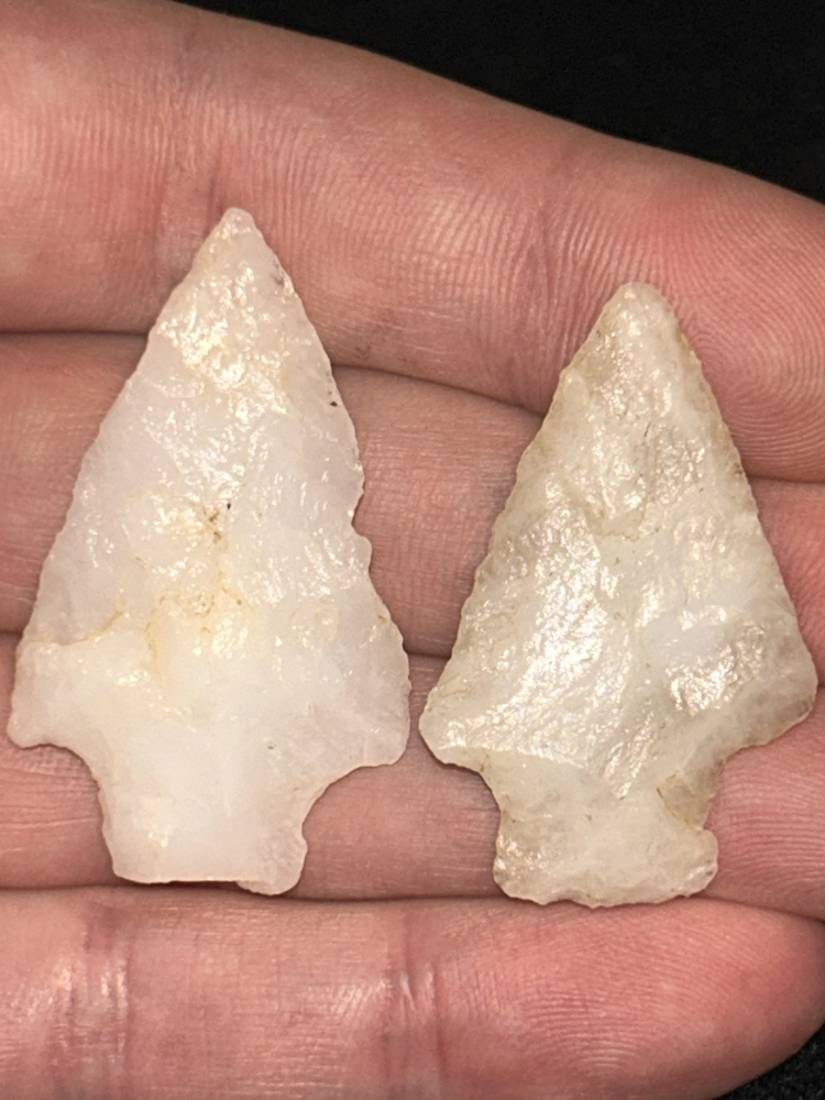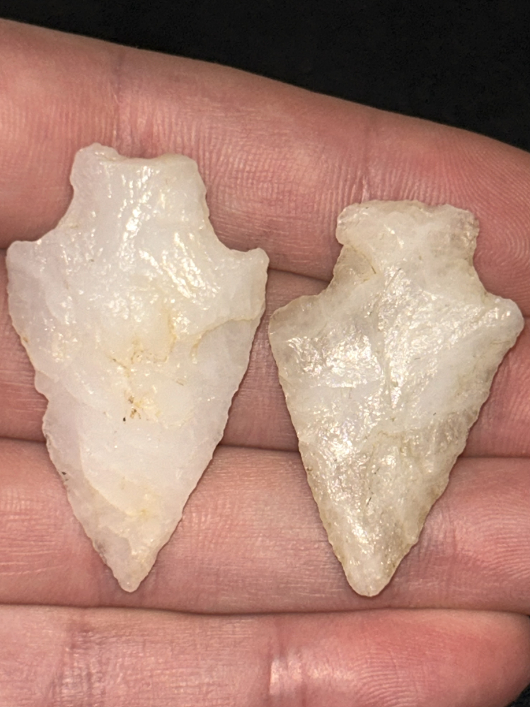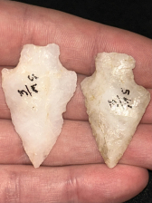 A fine pair of stemmed points found in Northern Alabama. Both are nicely made of translucent white-grey quartz. Ex: Billy Wayne Smith collection.