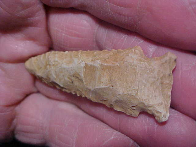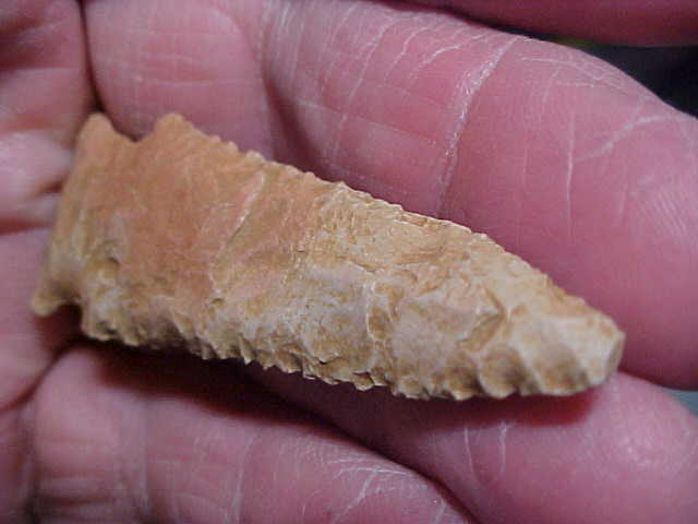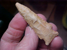 A Stilwell with a 'main face' trait you just don't see on Early Archaic Stilwell points-- a half-length flute. What's a puzzle is that at the single thickest spot my caliper barely goes over 1/4"--so why flute the piece, it wasn't necessary. What I've asked myself is whether the Stilwell was made from a fluted point--a Paleo point. If so, the knapper did a masterful job of converting an auriculate base point into an expanded stem Stilwell. The reverse face shows only one very thin 'thinning flake', so that may mean the flute was original to the Stilwell, the piece was a converted earlier style point, but can I explain that flute--NO. Length of the 'cherty' possibly lightly heat-treated chert is 2&5/16" by 13/16". "Tan chert" is about as accurate a chert type classification as I'll attempt. History: the piece was found in the Evansville, Indiana, area, it's well patinated, shows only a small tip chip in so far as damage, and the basal edge is decently ground--not heavy grinding, but definitely ground, and the blade edges show the serration of many Stilwell points. Shipping is $8.00, and payment can only be by check, cash, or M.O. as I do not use payment services (like paypal)--Roy A.