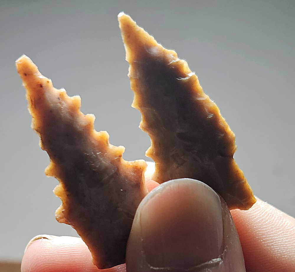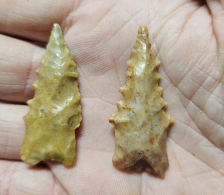 Excellent pair of San Jose points from Apache Co, AZ. Both are super well made and have wicked serrations. Very unique early type and great materials. Largest measures 1 3/4 inches long. Great stocking stuffers!