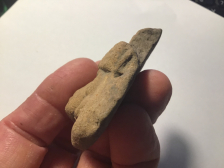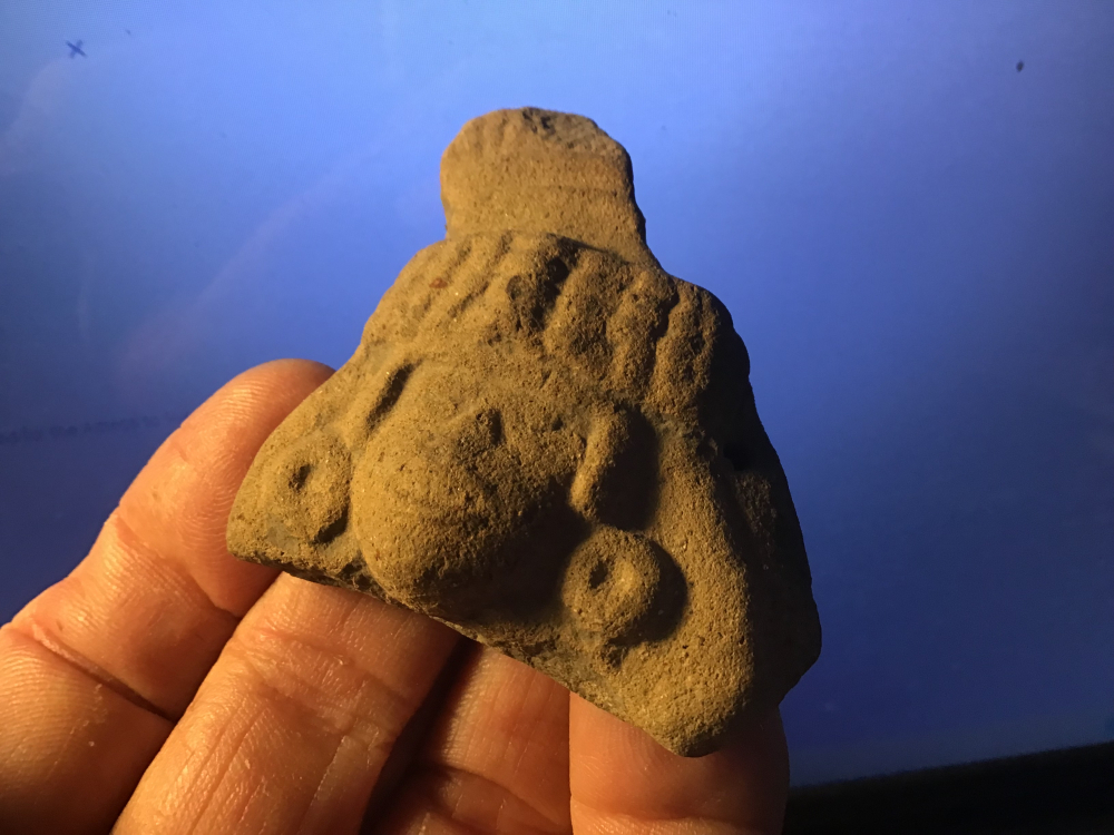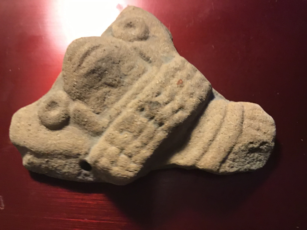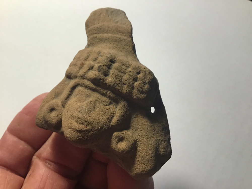 Found in Mexico, these pottery heads were often thrown in fields to increase crops. Not sure that is the case here since it has a hole drilled in it for what appears to be use as a pendant. I will guarantee it to be ancient and authentic. I have the shipping.