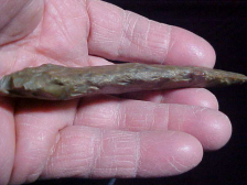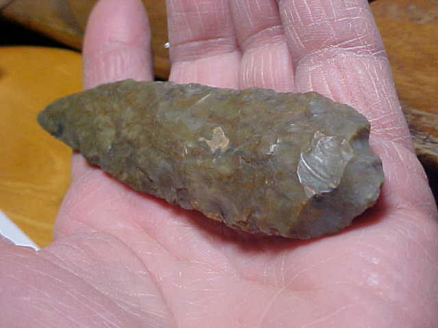 At 4&13/16", there's some size to this Cobbs Triangular. Width is 1&3/16", and next to the base the thickness reaches 9/16"--the blade isn't thin until it reaches the very tip. The long knife is out of the Sullivan/ Knox County, Indiana, area, but that flint is one--because of the creek stain-like patina--is hard to classify--it has some fossil inclusions, the tan spots, and a very good gloss, so if the knife is Attica (as I suspect) it was a higher grade of Attica (Indiana Green). Usually, that flint has a coarser grain, nowhere near this much gloss, but every flint/ chert has differing grades to be found. Note the blade edges on this long, narrow Cobbs, they're very heavily used--this was a hand-held knife that saw long, hard usage...but that also tells you the piece is authentic, that's the trade-off. Shipping is $8.00, checks, cash, or money orders are the only three ways you can pay on my store (sorry, paypal users, I just don't use electronic payments)--Roy A.