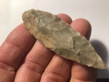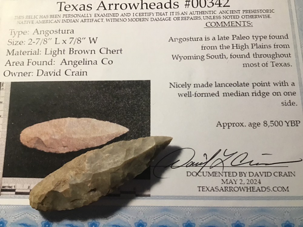 The base is lightly ground on this Angostura from Angelina County. It has a nice tip and rounded base, lanceolate point. I have the shipping and it comes with a David Crane coa.