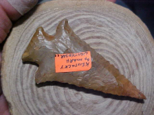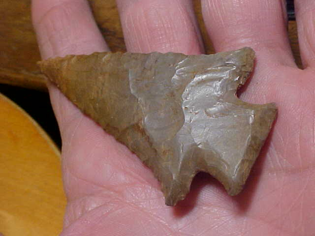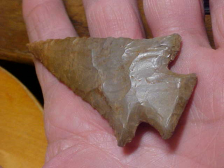 No 'hype' required when a point looks like this Hardin, a brown creekstain on the Hornstone that colors the piece a 'bronze shade'. Length is 3&1/8" by slightly over 1&11/16", with the single thickest measurement reading 5/16" between the barbs. Basal grinding is excellent, barbs are about as perfect as any you'll see. The piece is guaranteed authentic, period. NOW--why is the price so LOW? I bought the piece at an artifact show--from people I know and trust--however what wasn't noticed was that the 1/4" glued-back-on tip. The point is half price because of that tiny fragment that's glued on. Somebody gets a bargain on what WAS a grade 10 point because once upon a time someone got careless. One note: I don't blame the friends I bought the piece from, I doubt they caught the tip break either. In some lighting you won't notice the break, but when you put any (and EVERY) purchase under a loop (as I do), sometimes you "grin and bear it"...and, if sold, you tell any and all faults. Personally, I think the 'glue job' is needing professional repair; Keith Etchison would be my first choice if I would send the point off--you may use Bushey or one of the other artists in repair work--your choice. Shipping is $8.00, checks or M.O.'s (or cash) are the only ways you can buy this piece as I do not use paypal-type payments--Roy A.