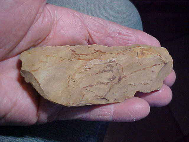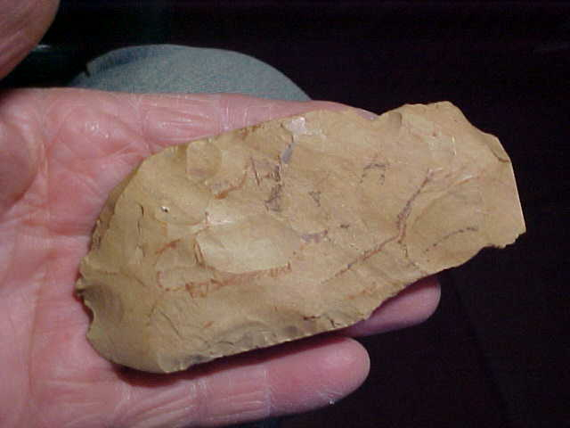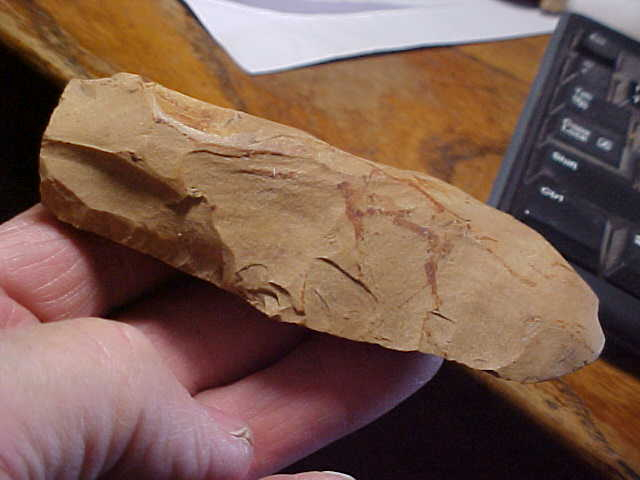A lot of use, all of it dating back to the Mississippian Culture in Henderson County, Kentucky--1250--1400 BP. The Adz shows more bit salvage and reuse than, well, usual, but notice in the close up photos where the bit area has excellent polish--you don't grind the flake scars off a hard chert in a few minutes, this Adz was some dugout-makers' favorite canoe making tool. Length is 4&3/8" by 2", with a max thickness of 7/8" (and a strong polish down that medial ridge). The upper end shows the indented edges where lashings (sinew) held the Adz head firmly in place. Note a 'dimple' where wedges were likely inserted under the lashings to stop the head from moving as charred wood was removed from the dugout. Neat tool, real. Shipping is $8.00, checks, cash, or M.O.s welcomed--Roy A.