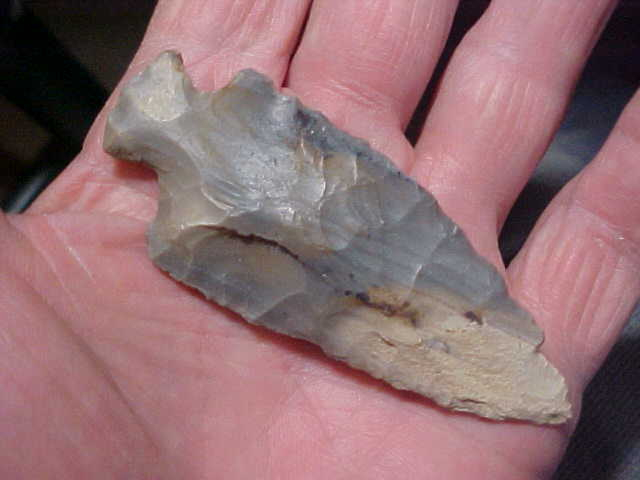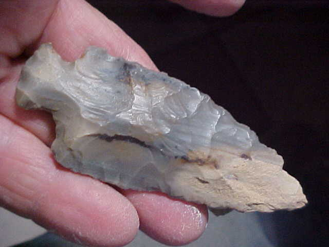 Some points, size & color come together--they do on this 'river find'. Now was the piece found on the Indiana side, Vanderburgh or Posey, or on the Kentucky side--Henderson County--that the finder didn't mark, but you know the area of the find, and that Motley's are a point indigenous to that river. This colorful piece measures 3&5/16" by 1&1/4"--one face has a slight 'stack', so thickness hits max at 7/16" measured there--but thins considerably toward tip and base. The tip is knapped into the cortex of the Hornstone. One note on that cortex--it looks like an edge flake broke free and the Motley culture knapper made a small repair--you can feel use polish in that slight notch-in, so it may have served a secondary purpose as well. The basal edge is dulled--won't describe it as 'ground', but it's deliberately dulled. An excellent blade, guaranteed in every detail. Shipping is $8.00 with checks, cash, or money orders the only ways I take payments. Sorry, that leaves out paypal--I do not use it--Roy A.