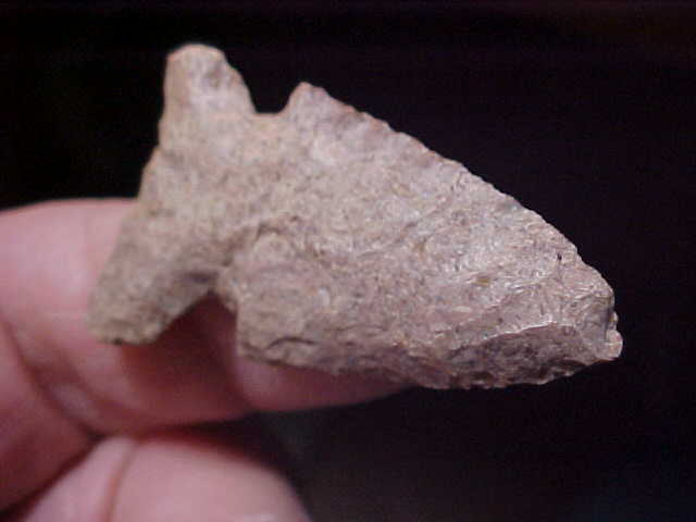 Heavy, heavy basal edge grinding on this Big Sandy, a fossil chert (heat treated as the red color indicates) that measures 1&11/16" by 1". Thickness isn't quite to 5/16", and with a base as wide as this Early archaic point has, there was considerably more blade as the point (knife) was first made. When the piece was sharpened to the present length I would expect it changed to a hafted dart, there not being enough bade length for cutting. There is one small patinated ancient chip at the very tip--or just maybe that was intentional to get a very sharp tip--it IS. The finder hunted up-and-down the Ohio River to the west of Evansville, Indiana--he didn't mark which site (or side of the river) he was hunting, but you have the area where the piece was found--it's real, period. Shipping is $8.00, checks, cash, or money orders are the three ways I welcome payment. Sorry, I do not use paypal-type payment services--Roy A.