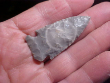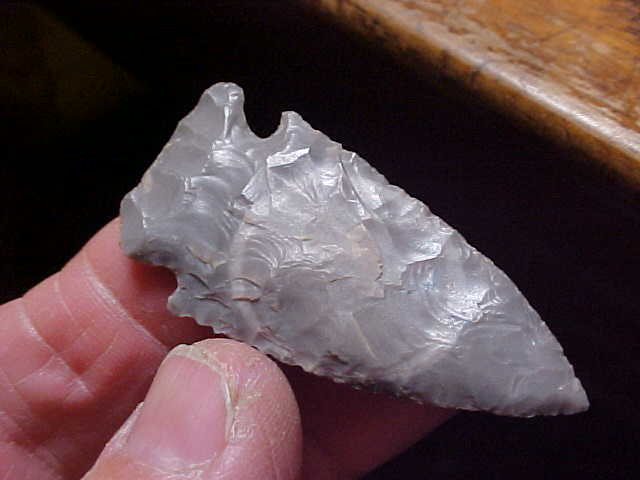 The picture doesn't lie--fine quality hornstone, fine bullseye ring centered on the blade. Now, as the piece isn't serrated I don't view it as a "Palmer", but then the basal edge shows heavy basal edge grinding. Is it a Kirk Cornernotched dart, or the related Palmer (Kirk Darts with serration)--that's strictly one's opinion, but I still lean to Kirk as serration is a pretty diagnostic trait of Palmers. The piece is out of a Vanderburgh County, Indiana, collection, area-found--measures 2&1/16" by 1" even--with a very thin profile at 1/4" max thickness in the blade center. The 7500 BP hunter salvaged one basal corner, the flakes are old, patinated. Every detail is guaranteed authentic--finders' name goes to the next owner, it has that much history even if he didn't tag any site location. Shipping is $8.00, checks or M.O>s are how I welcome payment. Sorry, I do not use paypal-type payment services--Roy A.