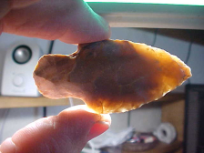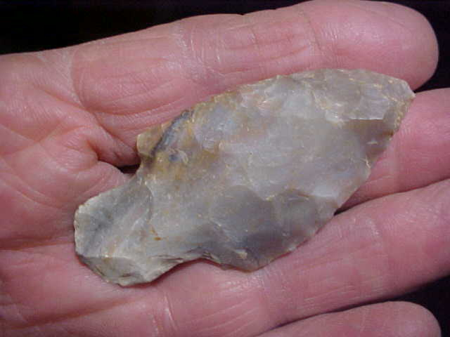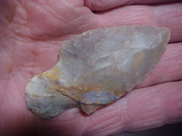 An artifact show, some time back, I tried to ask the seller "Where's it from?"--not being a Kentucky piece unless it was found right along the Ohio River. His reply was a 'generic' "Central Kentucky". Yeah, sure, this material has a pretty defined distribution area, and 'Central Kentucky' ain't it, lol. So--this Adena, 2&9+/16" by a bit over 1&3/16", 5/16" thinness, is an Ohio piece--enough 'squaring' to the stem that I'd classify it as a Robbins-type Adena. There are a couple minor chips, the very tip and one barb to keep the price reasonable, but that find Chalcedony sure makes up for it. Great patina, guaranteed authenticity. Shipping is $8.00 with checks, cash, or M.O.s the only three ways you can buy the piece. Sorry, I do not use electronic payments (like paypal)--Roy A.