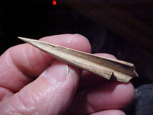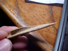 When you didn't have plastics, practically every needed tool that wasn't flint or stone, was bone--and usually the thicker legbones of deer or birds like turkeys. A split legbone could be easily (still time consuming) sharpened with any piece of sandstone is 2&1/2", sharpened to a needle tip. The finder spent a lot of time, I was told, hunting sites along the Ohio River, Henderson and Union County, Kentucky, so this awl is most likely from one site or another along the Ohio. Being a bird bone, it was hollow, so it's both very hard and light--if you were working to make hut coverings or deerskin clothing, you needed an awl that was very sharp--and stayed sharp--the work polish to the bone is a gloss, so it saw considerable use. Neat piece, real. Shipping is $8.00 with checks or M.O.s (or cash) welcomed, but I do not take paypal-type payments--Roy A.