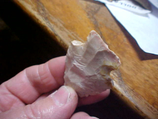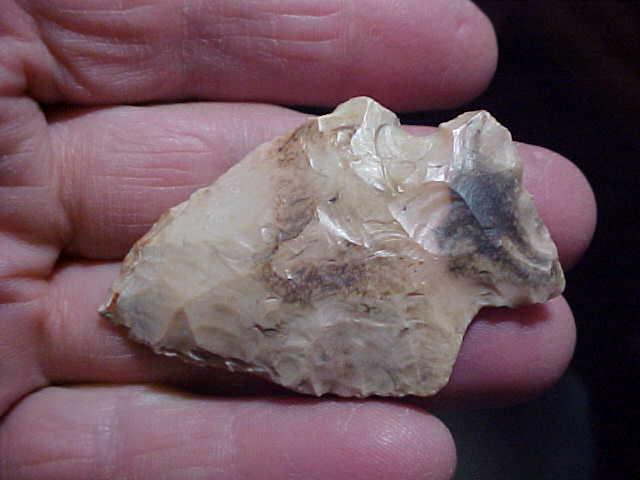 Shipping included on this "confluence of the Illinois and Mississippi Rivers" Burlington Chert (heat treated) arrowhead. Without any trace of basal grinding --and the wide body, I'm pretty sure it was a Hopewell Snyders point, so 1500--2,000 BP. If the barbs didn't have end chips you'd see more of the 'hooked' appearance of a Snyders...but then the price would be higher. Everything depends on how a piece survived, how much wear. Sometimes, though, color along is enough to add a piece to your collection. I did. Great knapping work, 2&3/16" by 1&1/2", 5/16" max thickness. I welcome checks, cash, or M.O.s but do not use paypal-type payment services--Roy A.