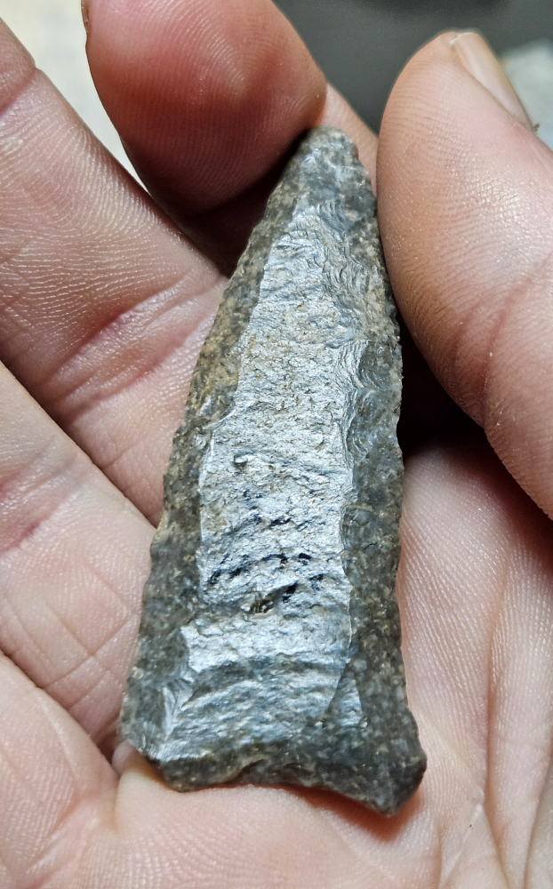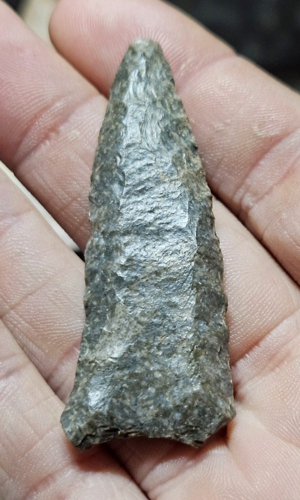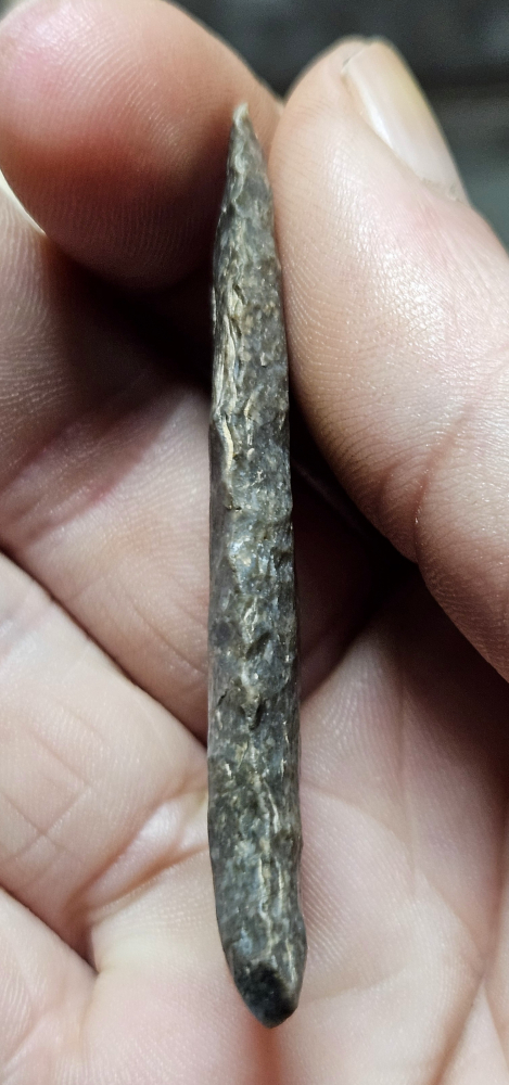 Amazing Cumberland point from Edmonson Co, Kentucky. This piece has undergone some resharpening which has lead to the basal flare being more prominent. Both flutes go all the way to the tip and the material is lovely harrodsburg chert. Measures 2 1/8 inches long. Don't miss this fine paleo!