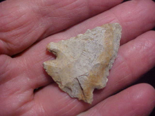 Out of the Spencer--Perry County, Indiana, area of S.W. Indiana--hornstone (as are something like 98% of ALL Turkey Tails), and exactly 3" in length; width is 1&7/16", 3/8" max thickness. A Late Archaic usage resulted in a tip impact fracture, a subsequent salvage (by the 2500 BP hunter), and likely some frustration as the ancient hunter was trying to work his way around that vein of intrusive quartzite--the tip was salvaged, but it looks like the hunter planned on thinning the width to get the sharper tip he was after. The point was lost before that happened. Still, that line of very hard quartz makes the piece 'striking'--you spot it in a frame before any surrounding points. Under a 10x loop the heavy buildup of patina makes this T.T. a "no brainer" authentic point. Shipping is $8.00, checks, cash, or money orders, but I do not use paypal-type payments--Roy A.