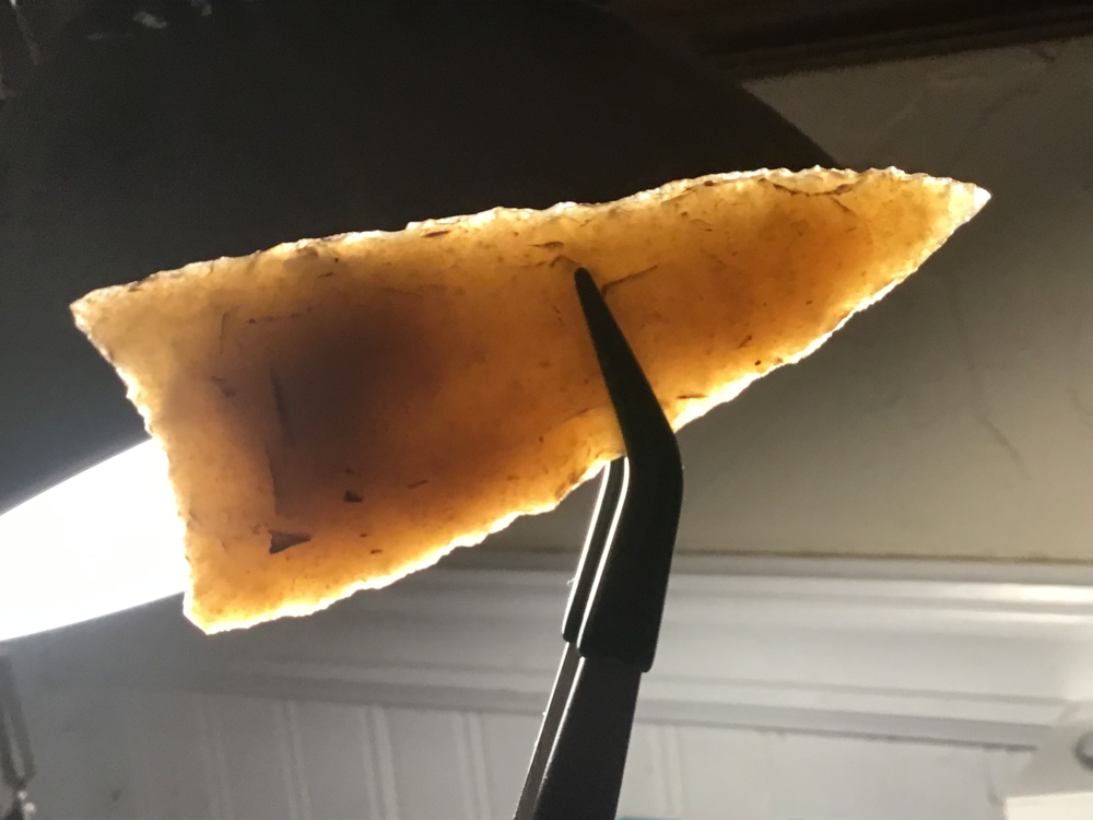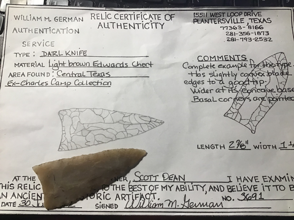 Very fine Darl Blade made of translucent Edwards. The point shows heavy patina to a fine tip and comes with a Bill German coa. I have the shipping.