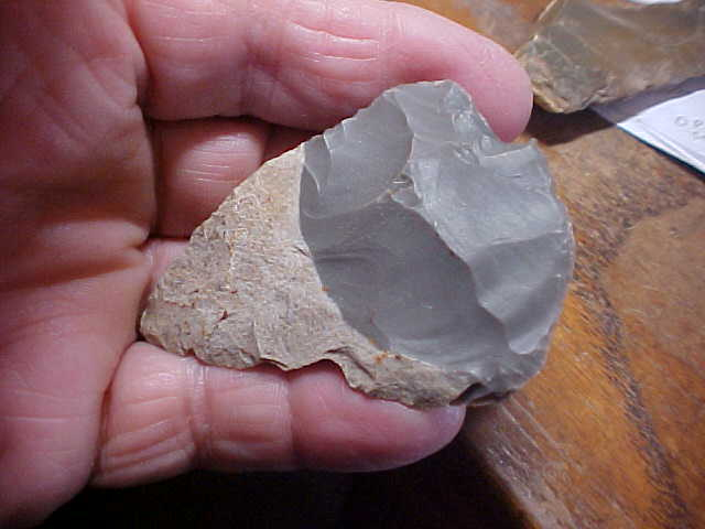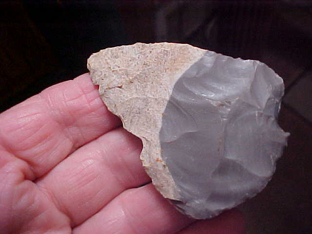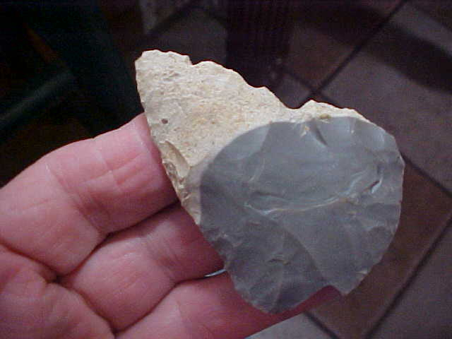 Could be your first artifact(to receive) in 2026, a Warrick County, Indiana, hornstone 2-tone knife---or a preffofrm for a point style if that notch on the basal edge was intended to make this "North Blade" a Snyders point (as I expect). Could be that basal notch didn't 'go as planned', something stopped the Hopewell knapper from converting the North Blade into a full hafted point style. Work polish along the shaft scraper on the edge indicates the piece saw plenty of work life, though--run a finger tip through the notch-in, you'll feel the work polish. Length is right under 2&3/4" (slight work use on the very tip may have contributed to the knife being 1/16" shorter than it started. Width is 1&15/16"--the blade nicely thinned at 5/16" max thickness. Visually, the color separation is striking, just a neat artifact. I welcome checks, cash, money orders, but do not use paypal-type payment services. All the best from my family to yours for a healthy 2026--Roy & Jo