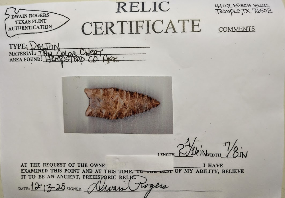 This is a very finely made, serrated, and fluted Dalton point. It was found in Hempstead Co., Arkansas, and comes with a Dwain Rogers COA. It's small, but they don't come much finer than this for a Dalton!.