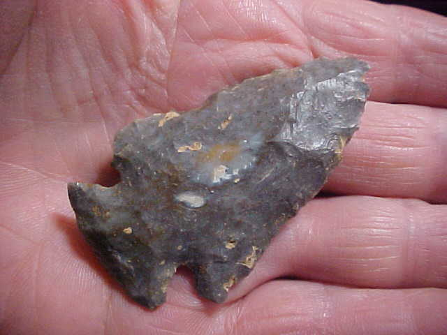 The flint on this Spencer County, Indiana, Lost Lake is the local "Holland Flint"--chalcedony, really, a very hard silicate material, but on this Lost Lake there are 'vugs'--cavities, that is, filled with iron deposits. Length is 2&7/16" from the VERY heavily ground basal edge to the small cavity that forms the tip--the flint had to have been a bear to knapp, you'd think. The Early Archaic knapper manages, excellent bevel sharpening, that parallel-type flaking seen only in Early Archaic culture points--funny, but beveling a blade, that technique simply died-off after the 7500BP era--why? This piece comes from al old family collection, passed from grandfather on down. It's guaranteed real, period. Shipping is included with the price, and checks or M.O.s are how I take payments. Sorry, I use no sort of paypal-type payment systems--best to all for 2026--Roy A.
